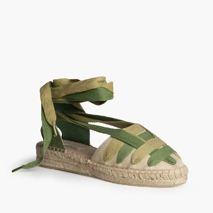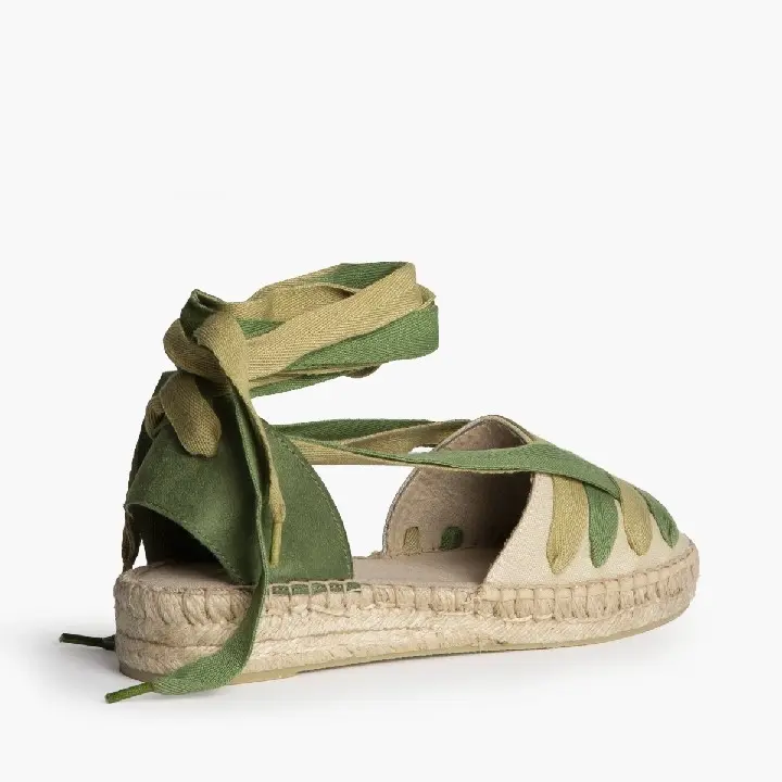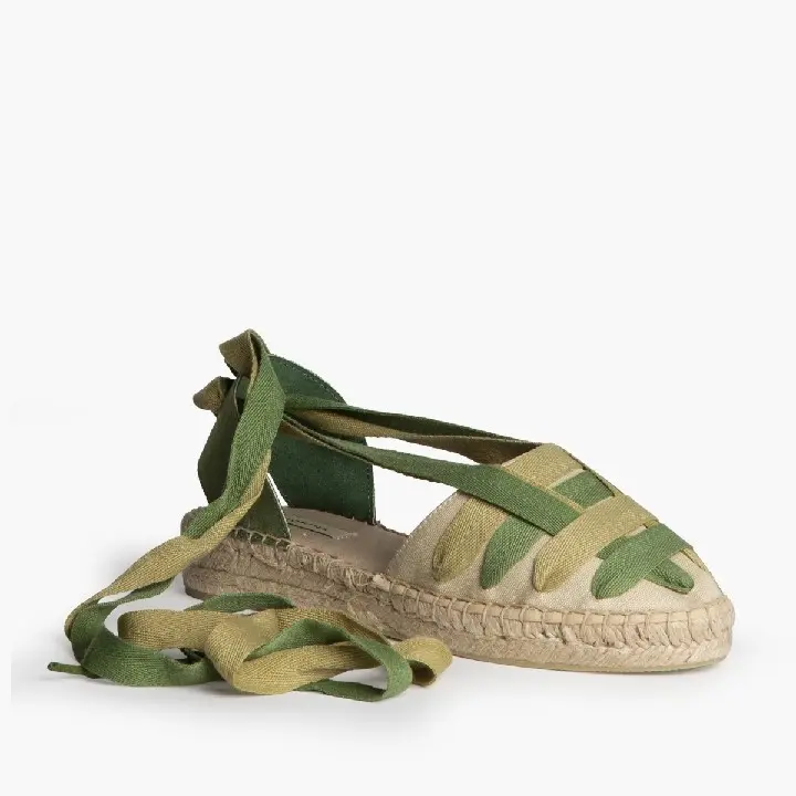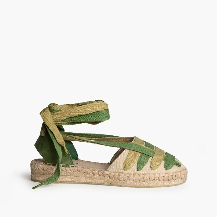 La alpargata de cuña con cintas en tonos verdes es una opción fresca, original y muy veraniega, perfecta para elevar tus looks con un toque natural.