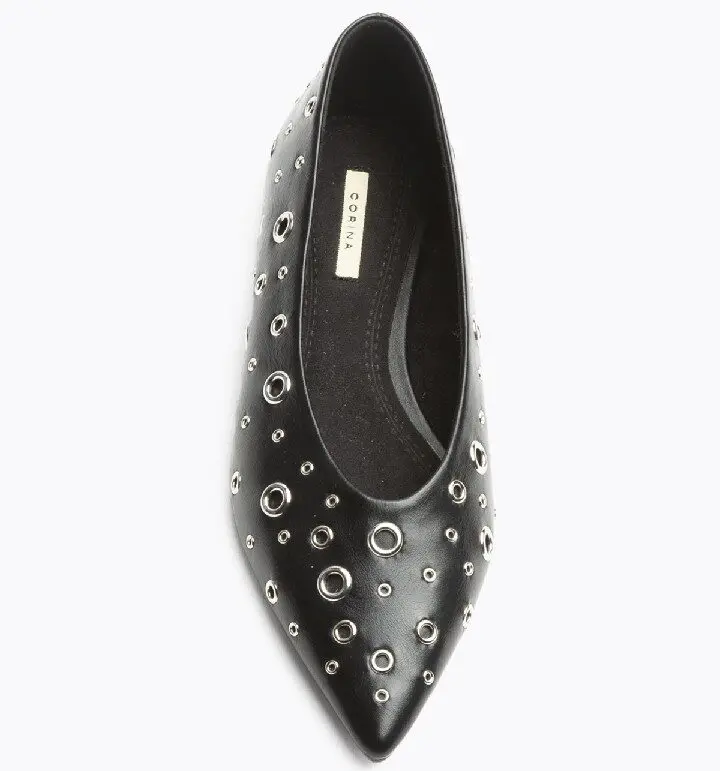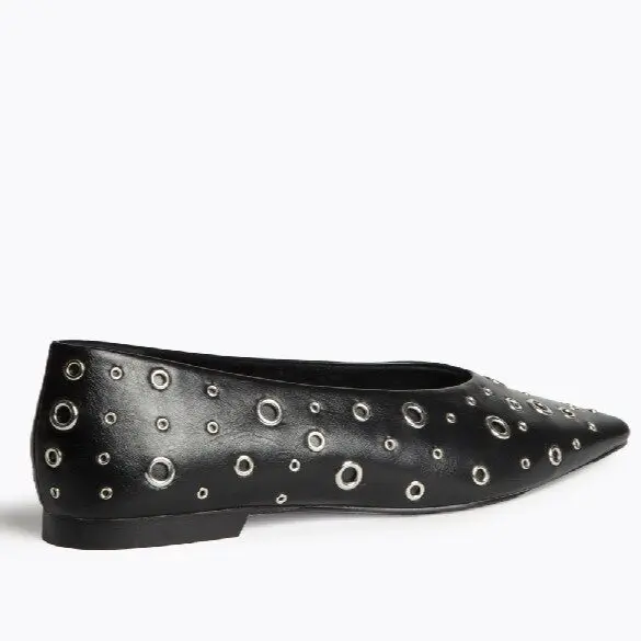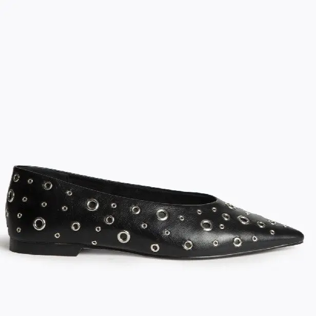 Zapato plano en color negro con diseño en punta y detalle de apliques metálicos circulares en toda la superficie. Un modelo de inspiración rock y urbano, ideal para quienes buscan dar un giro atrevido a sus looks sin perder comodidad. Su suela plana lo convierte en un calzado versátil para el día a día, mientras que los detalles metálicos aportan un toque moderno y diferente que no pasará desapercibido.