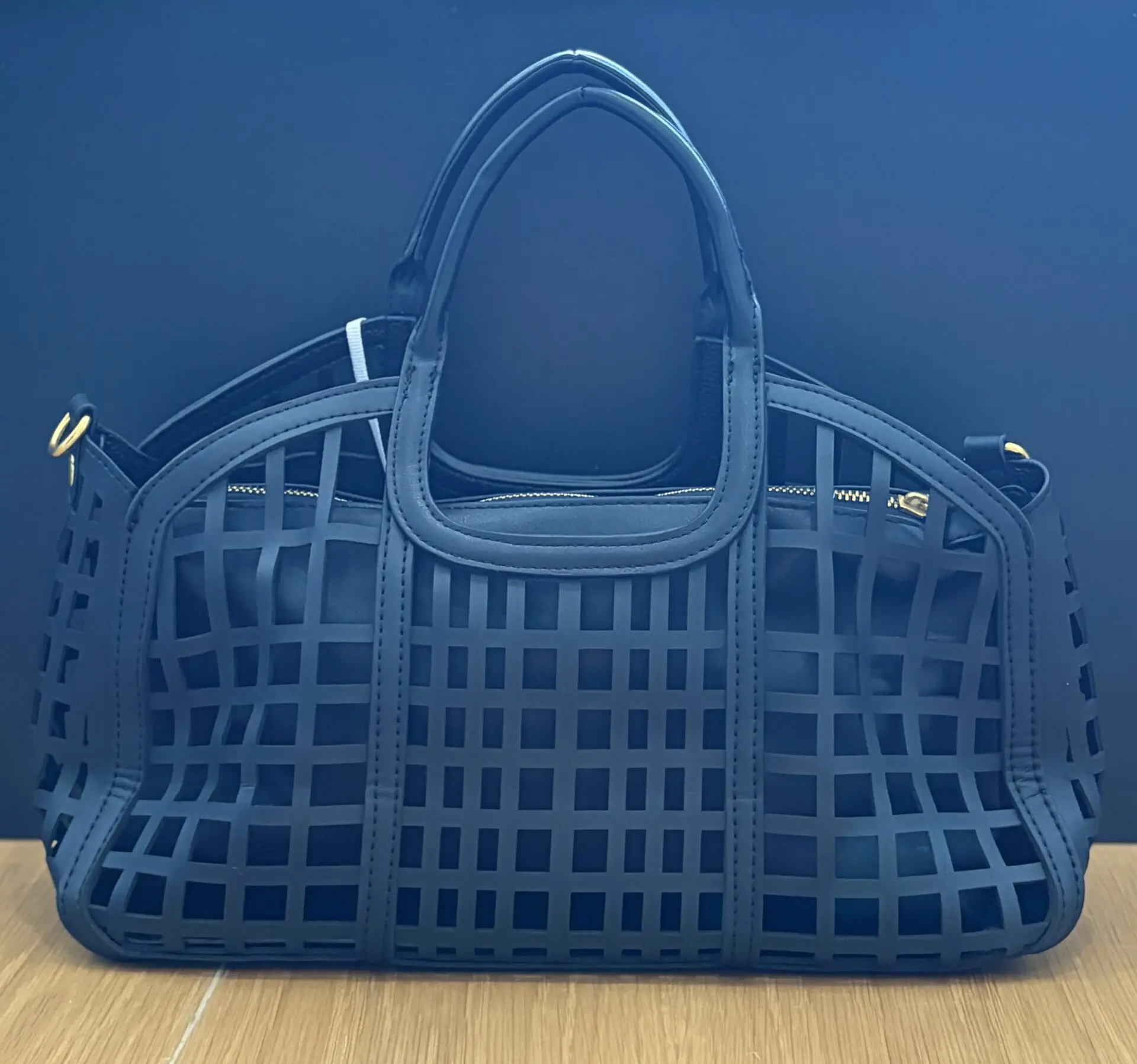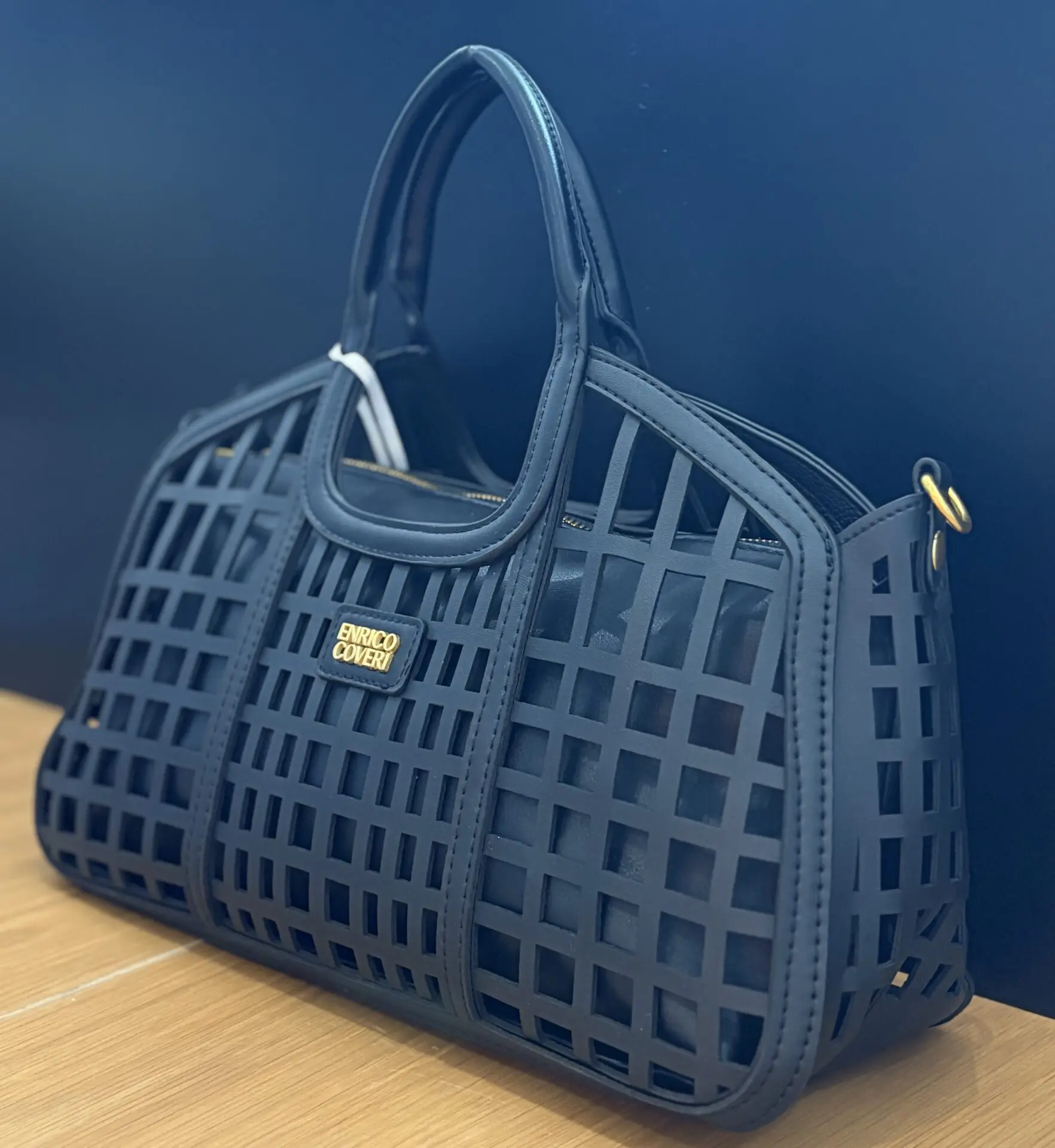 Su diseño destaca por el acabado troquelado geométrico, que aporta personalidad y estilo, dejando ver el interior de forma sutil. Incorpora doble asa de mano reforzada, proporcionando comodidad y firmeza, y además cuenta con opción de bandolera, lo que permite llevarlo de diferentes formas según la ocasión.
