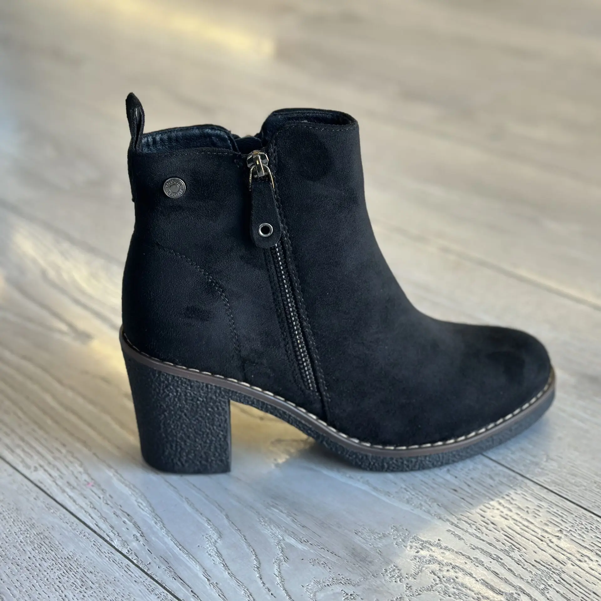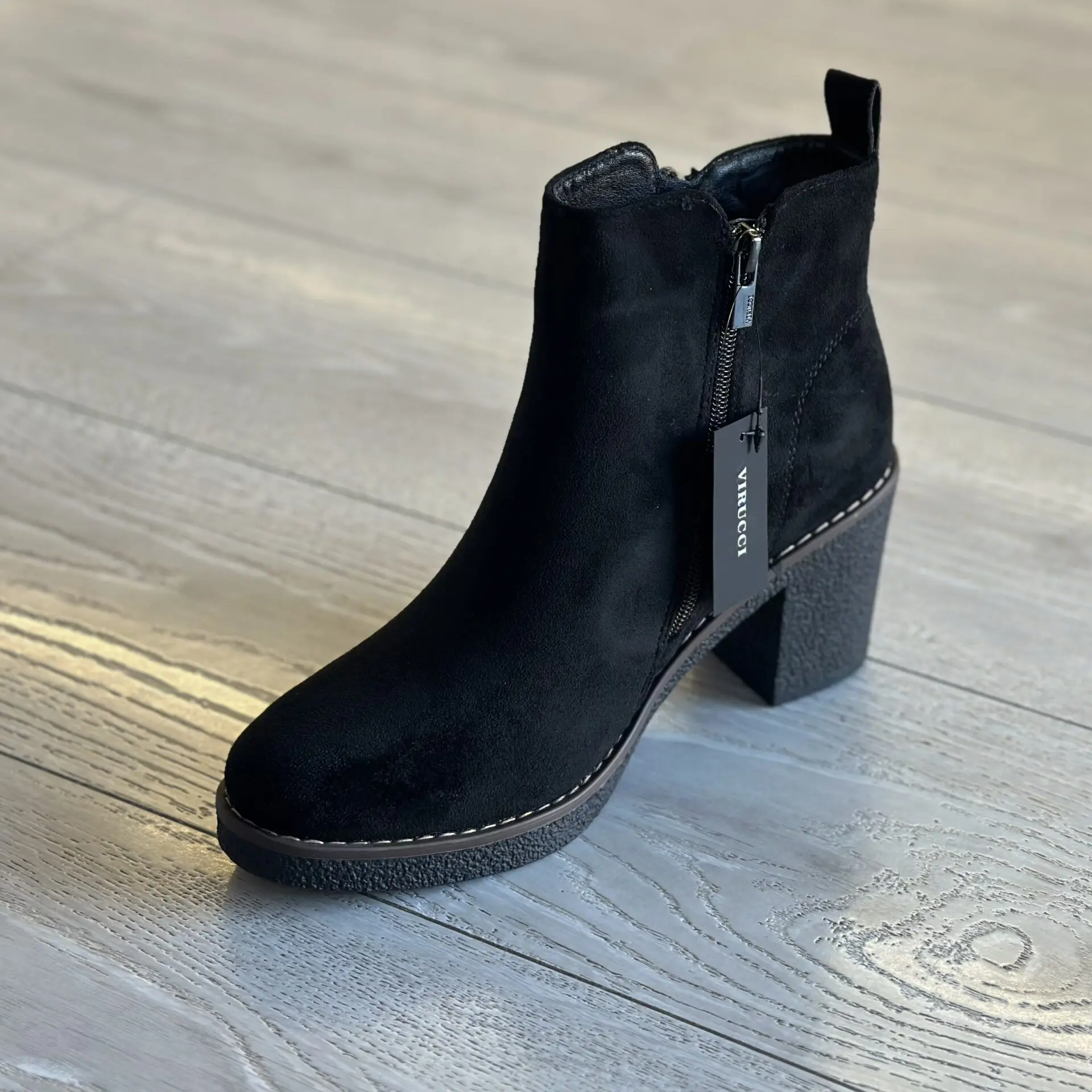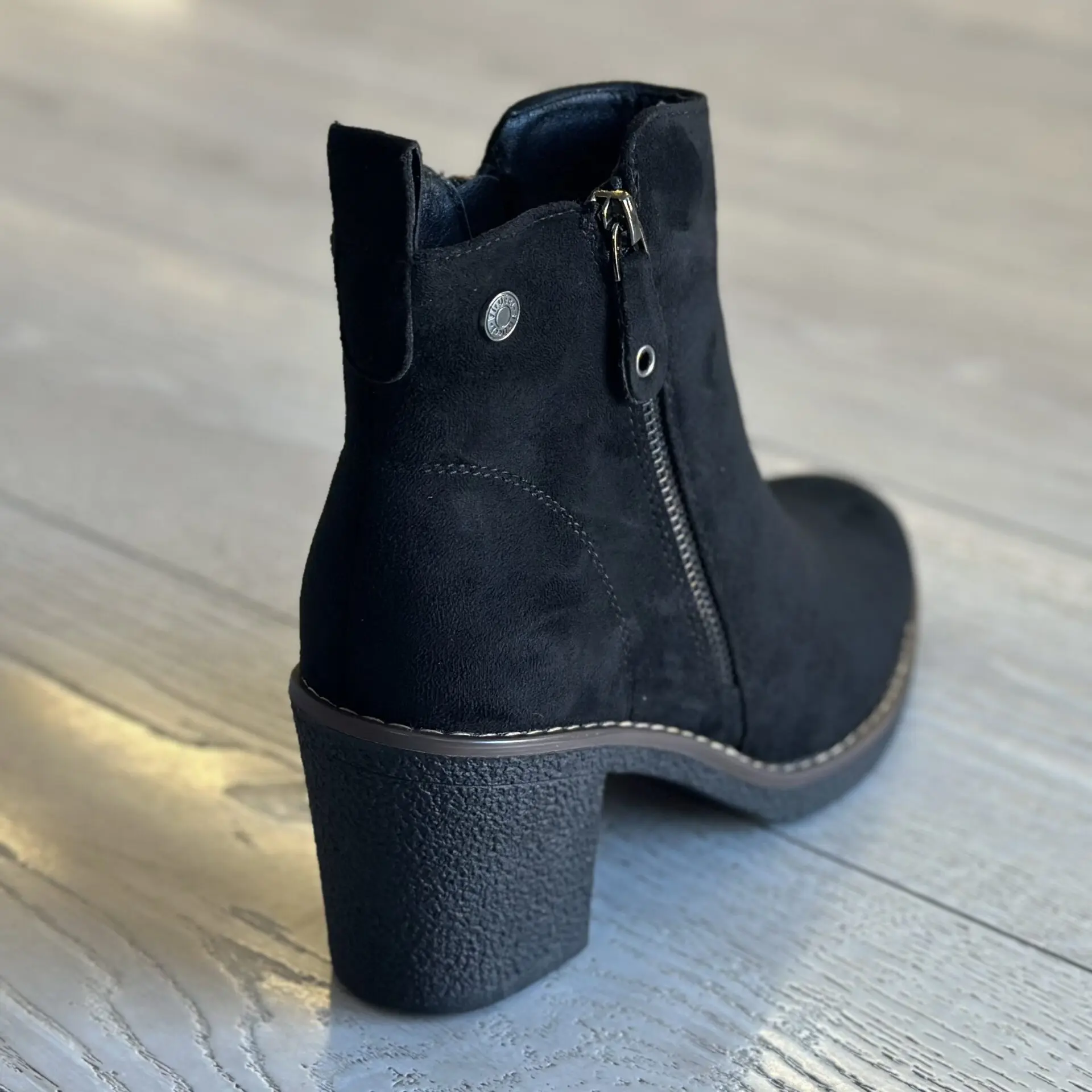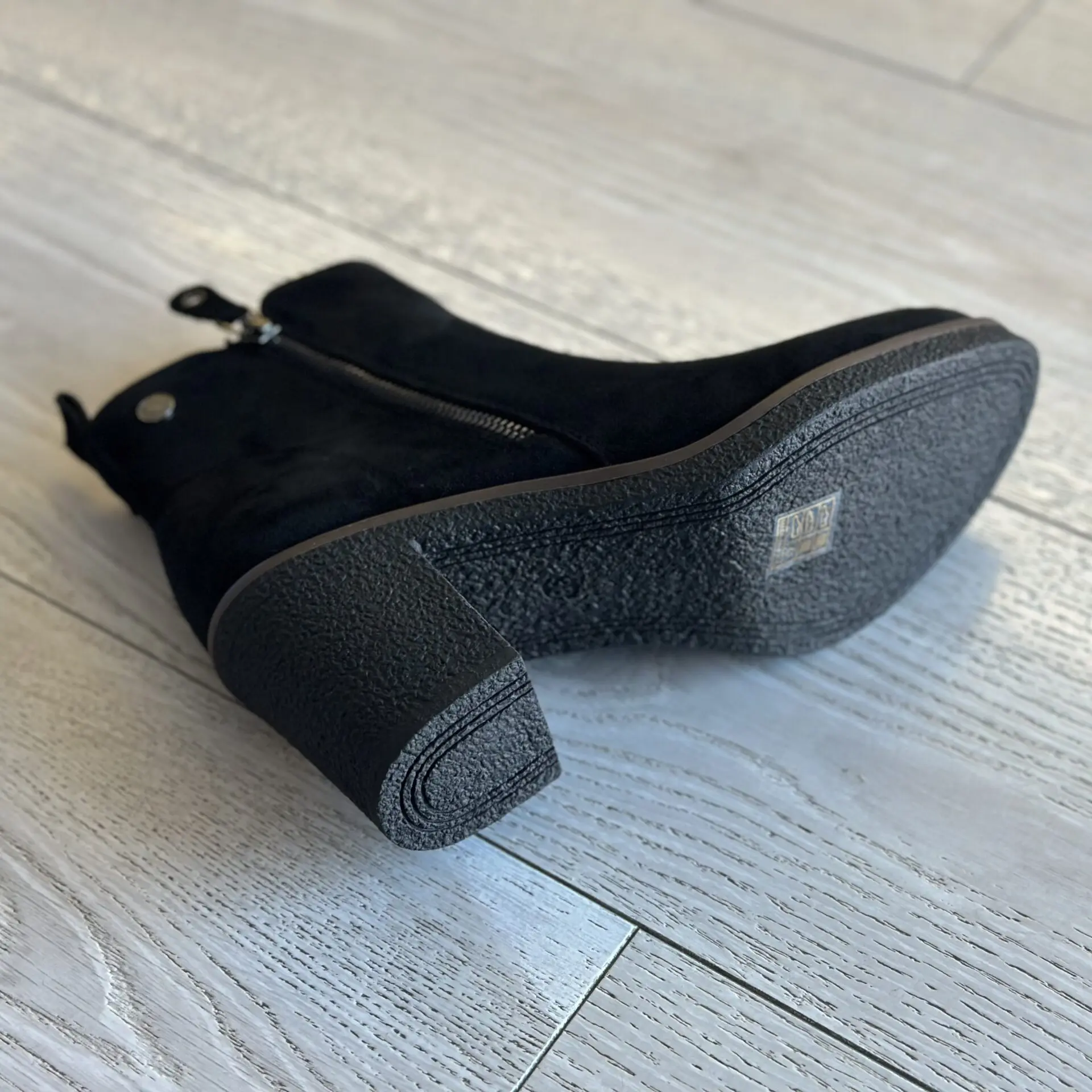 Botín de serraje en color negro, con tacón medio ancho y cierre lateral con cremallera. Su diseño atemporal lo convierte en un imprescindible del armario, combinando elegancia, comodidad y versatilidad.
