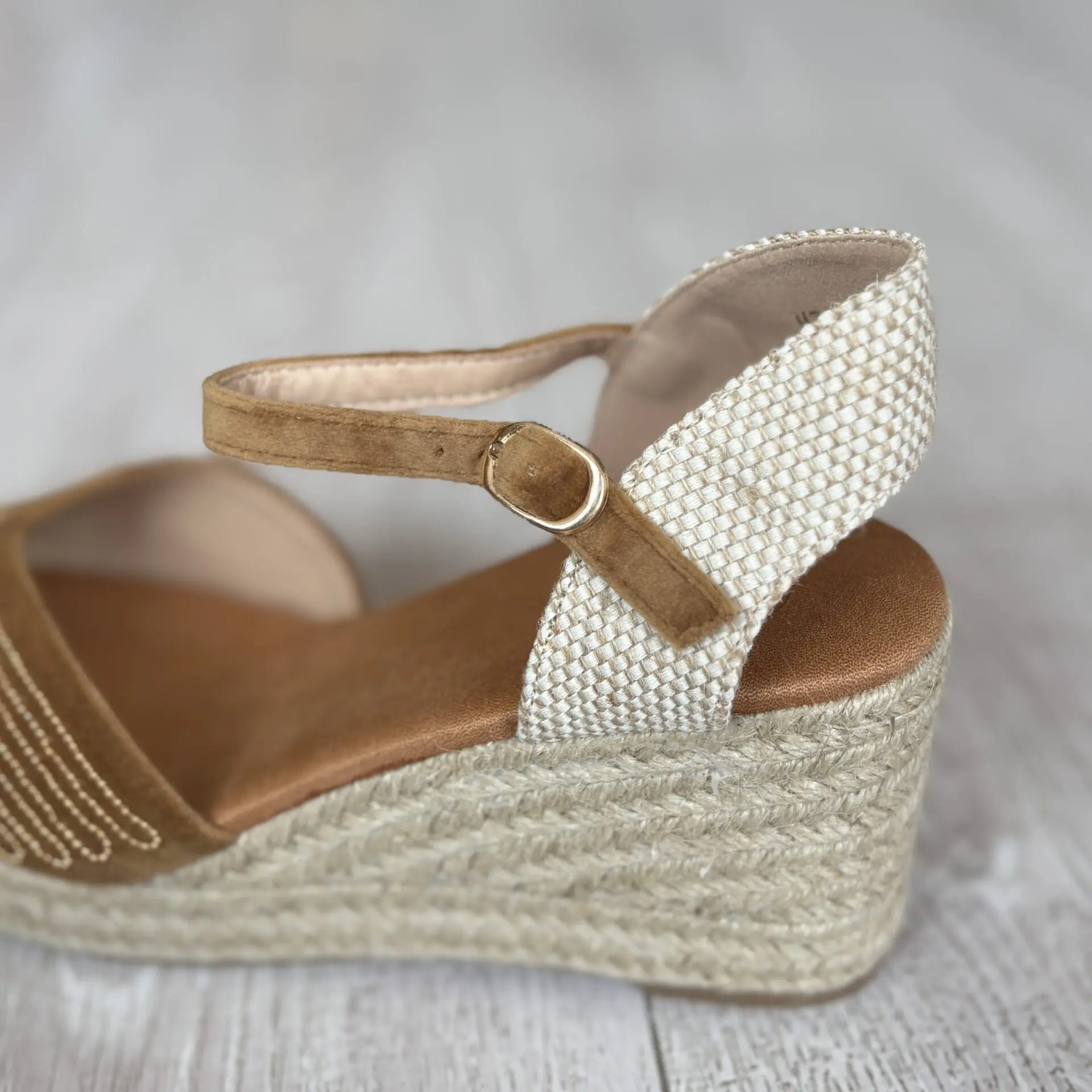 El acabado efecto ante en tono khaki le da un toque elegante y fácil de combinar, mientras que la pulsera ajustable al tobillo con hebilla proporciona una mayor sujeción y estabilidad al caminar. La parte trasera incorpora tejido trenzado en tono claro que aporta contraste y un estilo muy actual.