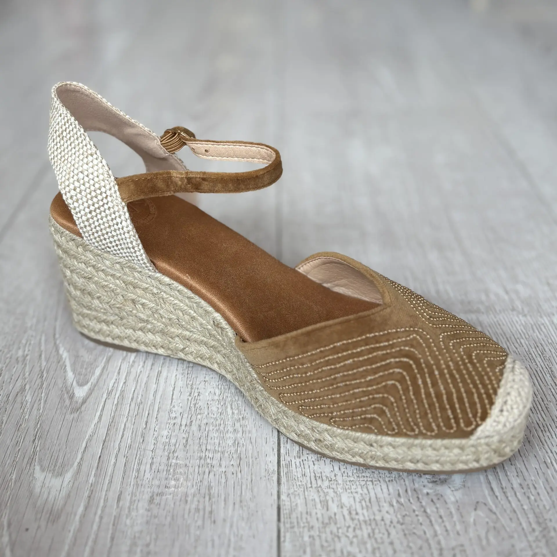 La alpargata de cuña en color khaki es el equilibrio perfecto entre comodidad, frescura y estilo veraniego. Su diseño combina una pala cerrada con bordado decorativo y una cuña de esparto que aporta un aire natural y muy mediterráneo.