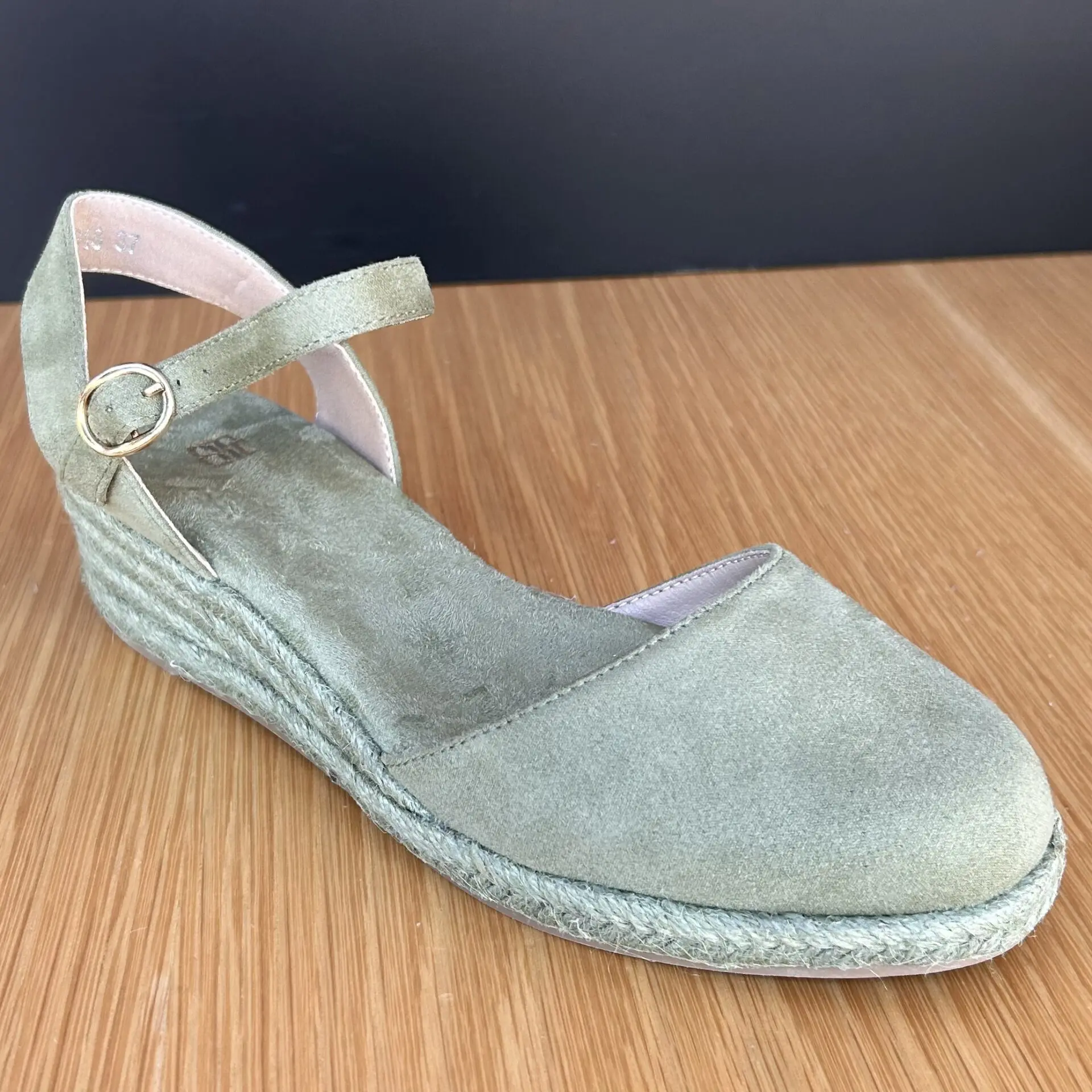 Alpargata verde oliva con cuña baja y pulsera ajustable. Cómoda, versátil y fácil de combinar, ideal para tus looks de verano.