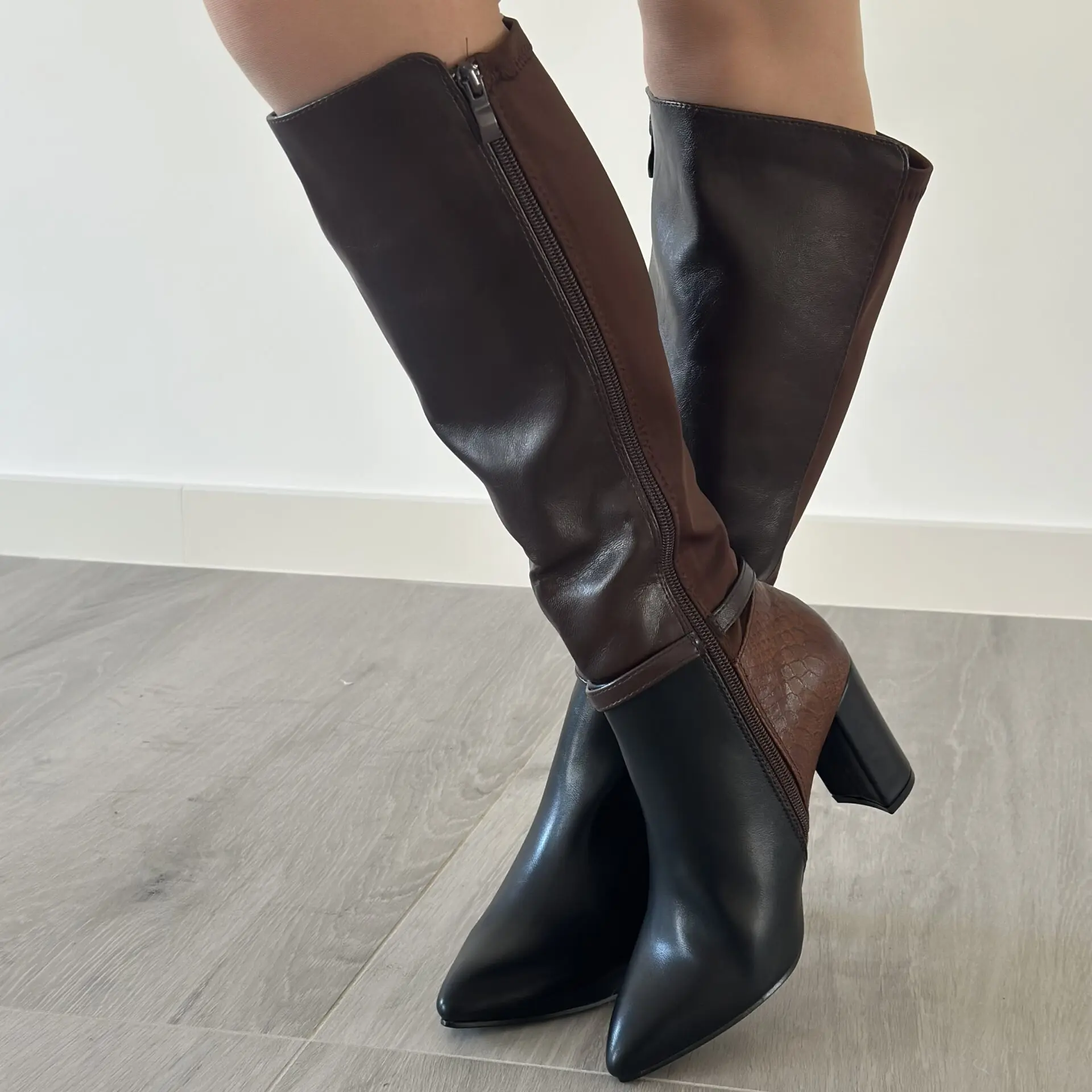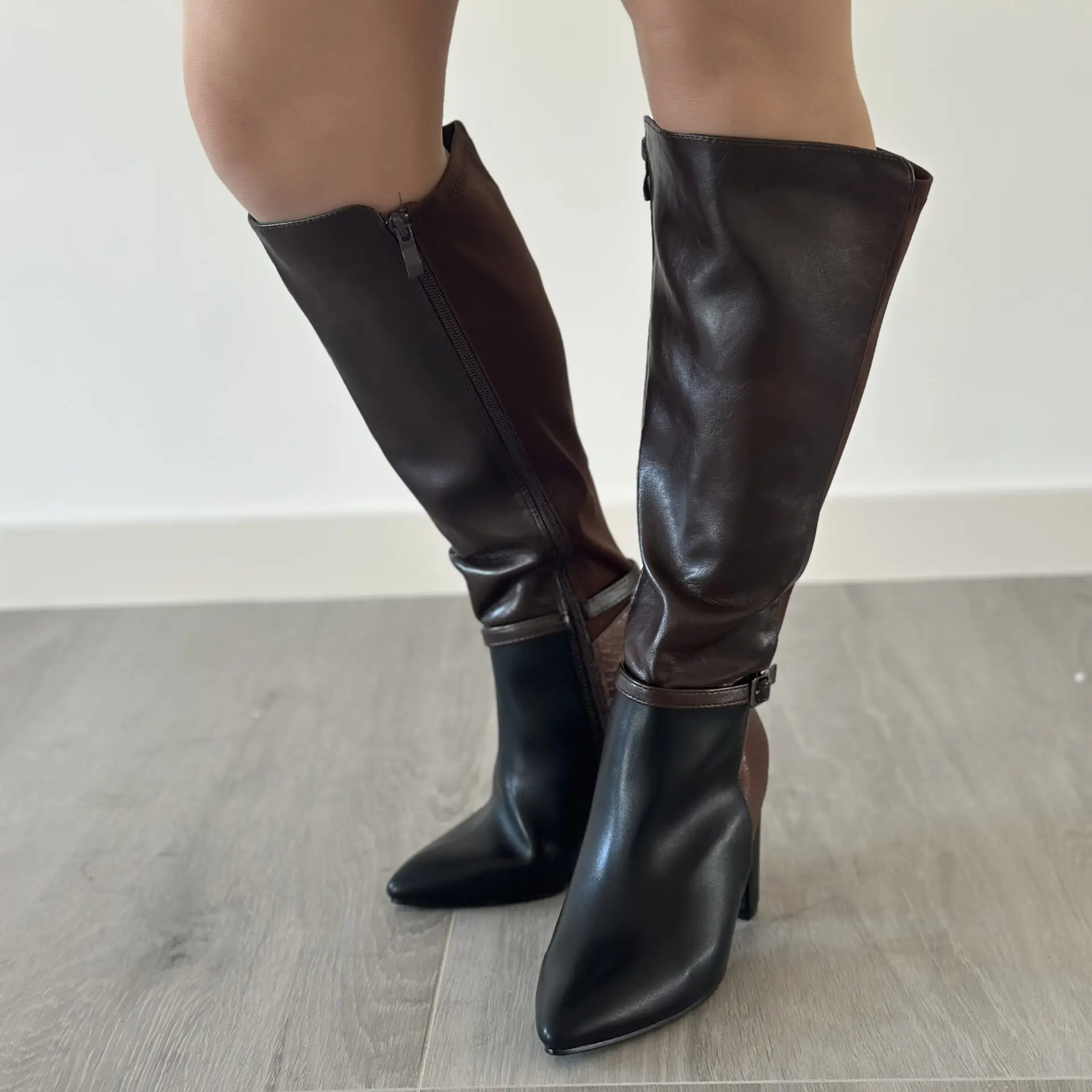 Bota alta bicolor en marrón y negro, con un diseño elegante y muy actual que estiliza la pierna y aporta un toque sofisticado a cualquier look. Fabricada en material de alta calidad, combina un acabado suave con detalles cuidados como la hebilla decorativa en el tobillo.
