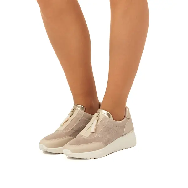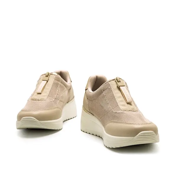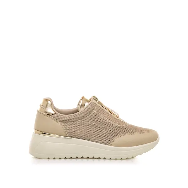 Zapatillas tipo slip-on en color beige, con diseño cómodo y actual, perfectas para el día a día. Su estilo sin cordones facilita el calce, mientras que la cuña ligera integrada aporta altura de forma cómoda y estable.