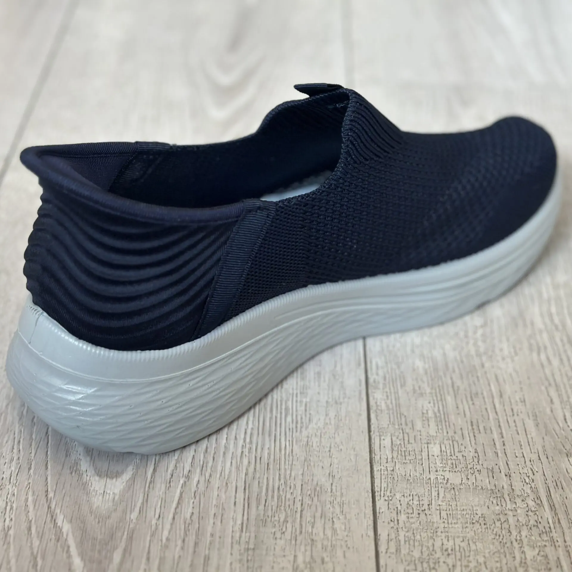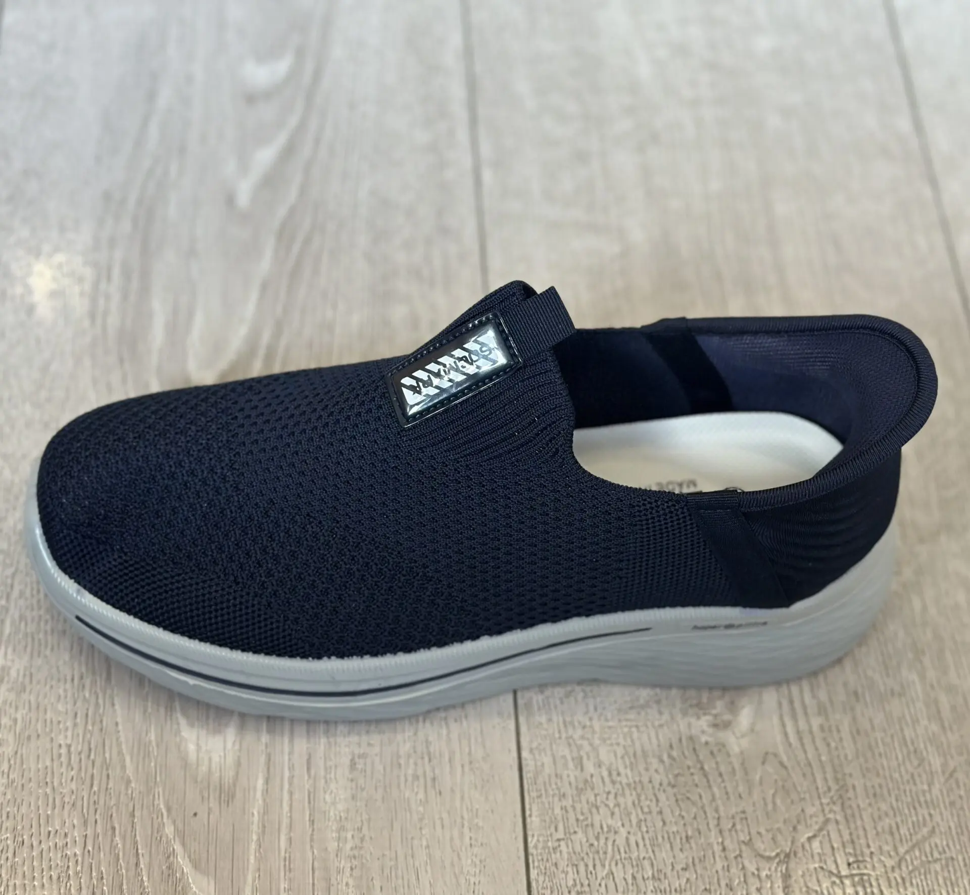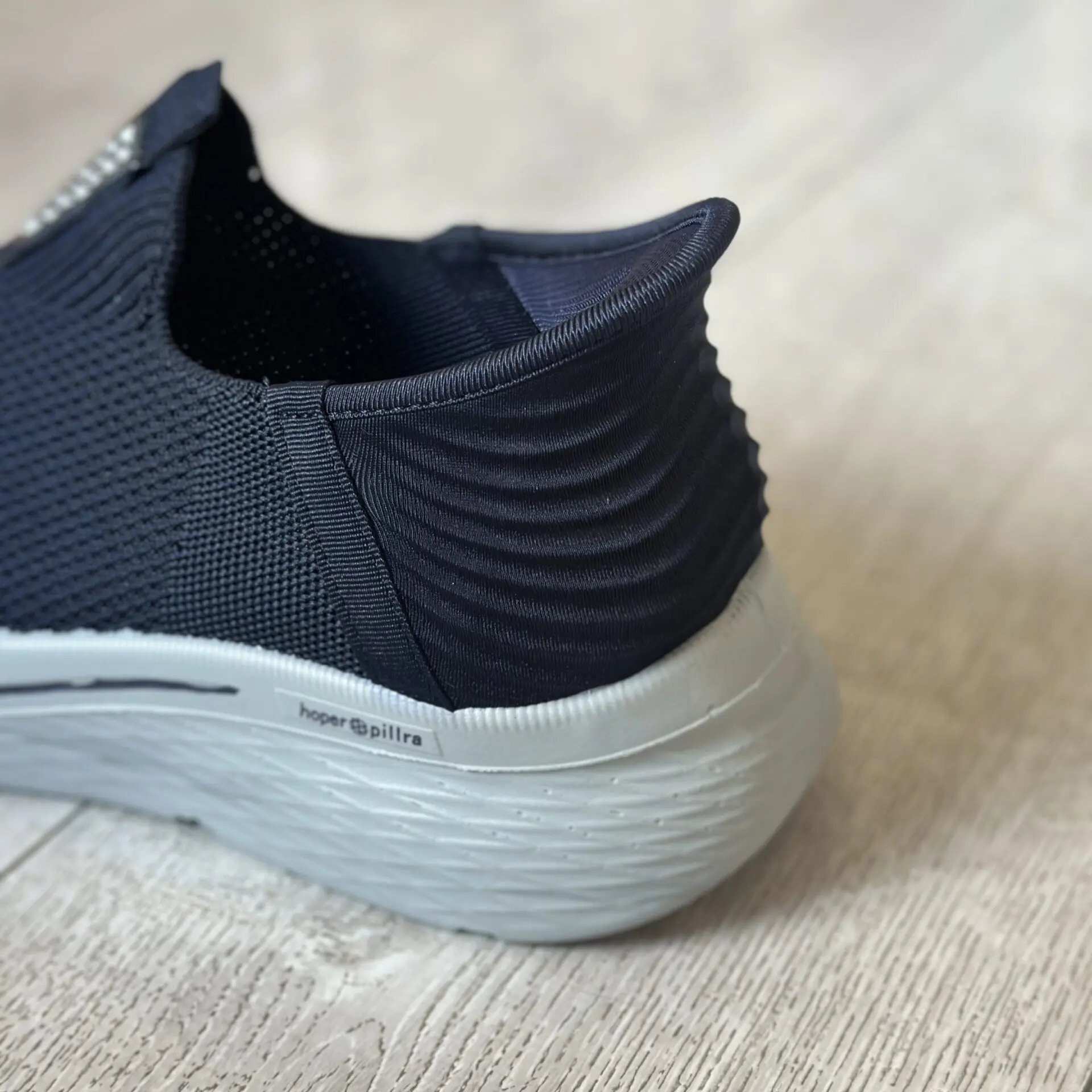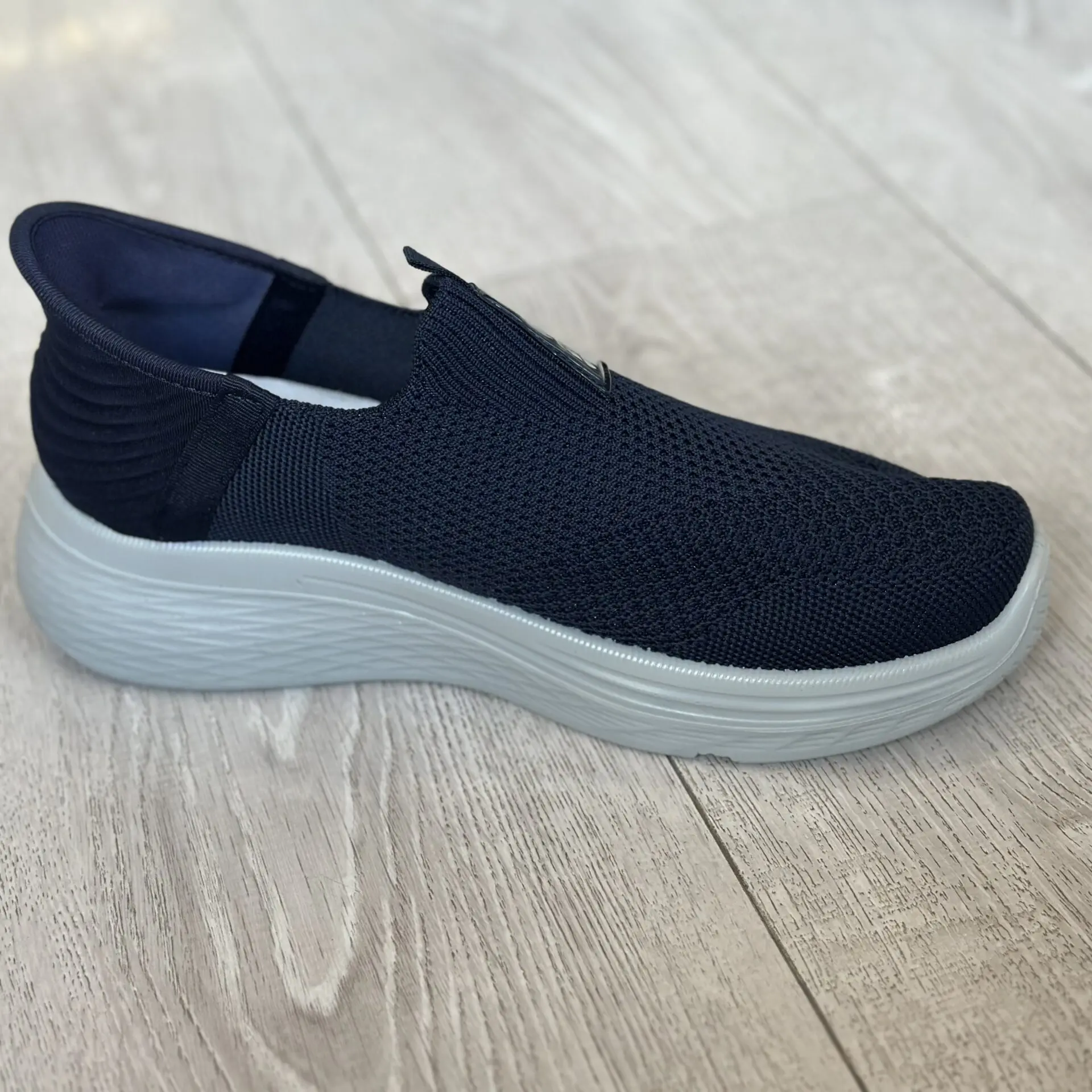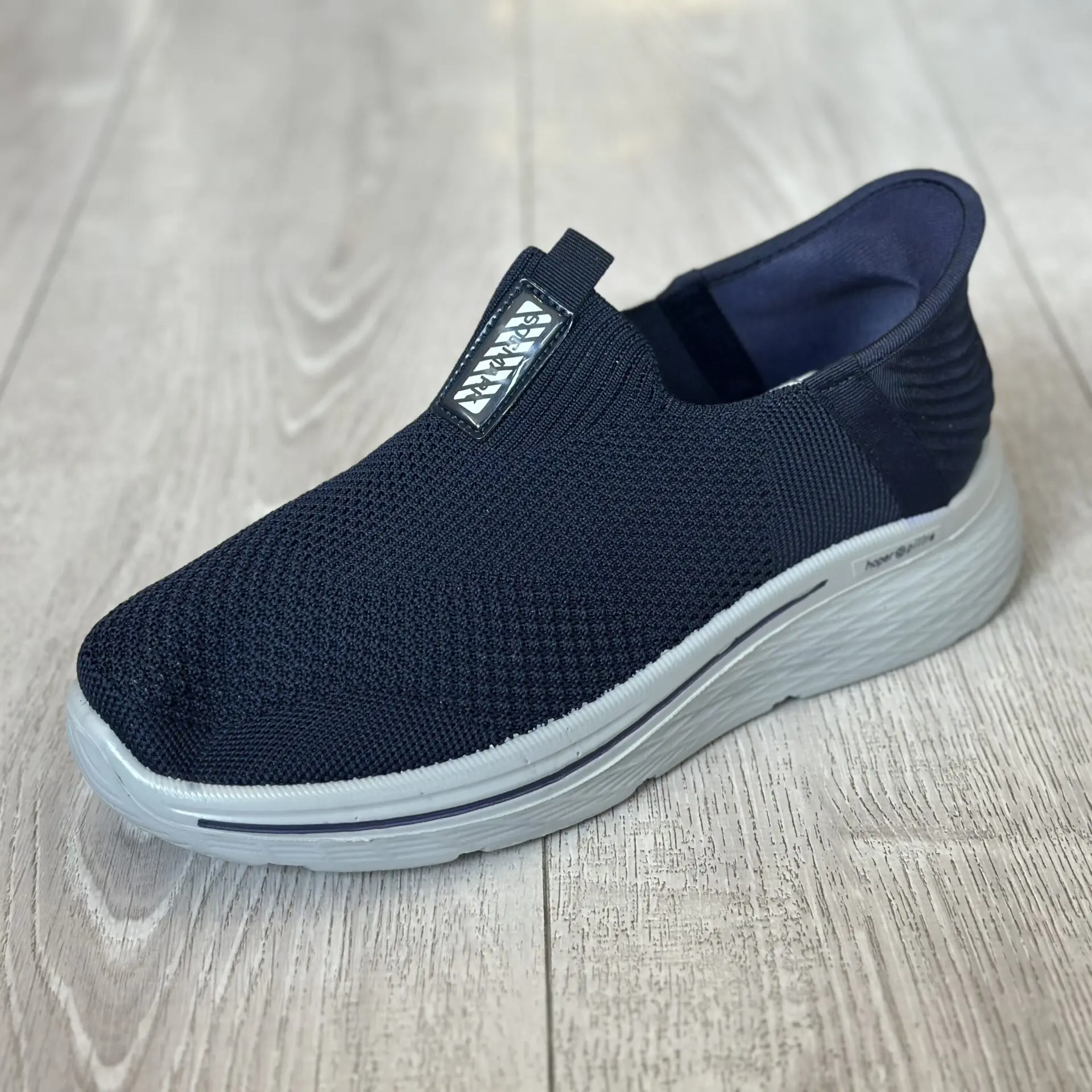 Zapatilla slip-on azul marino, diseñada para ofrecer la máxima comodidad en tu día a día. Su tejido elástico y transpirable se adapta perfectamente al pie, proporcionando una sensación ligera y flexible en cada paso.