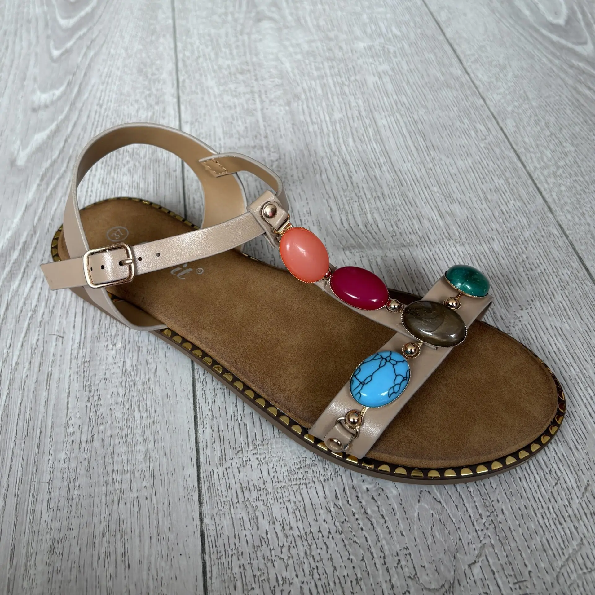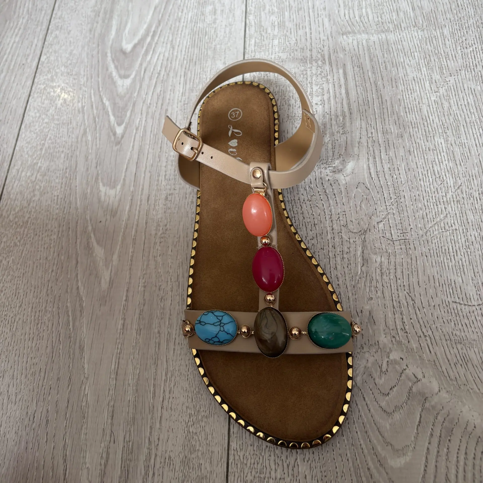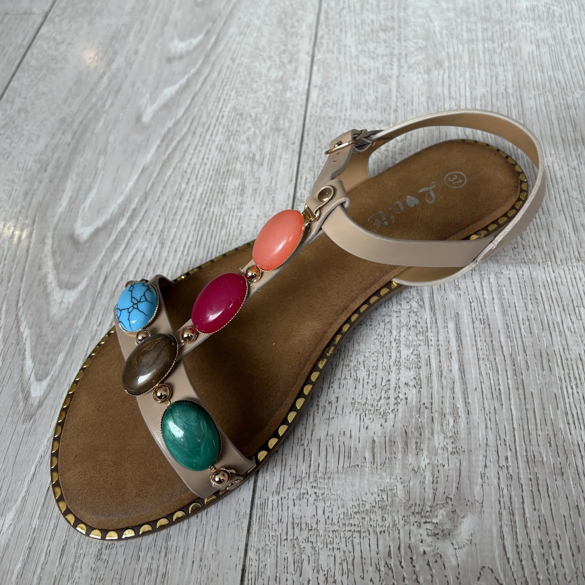 La sandalia plana con piedras de colores es perfecta para dar un toque alegre y original a tus looks de verano.