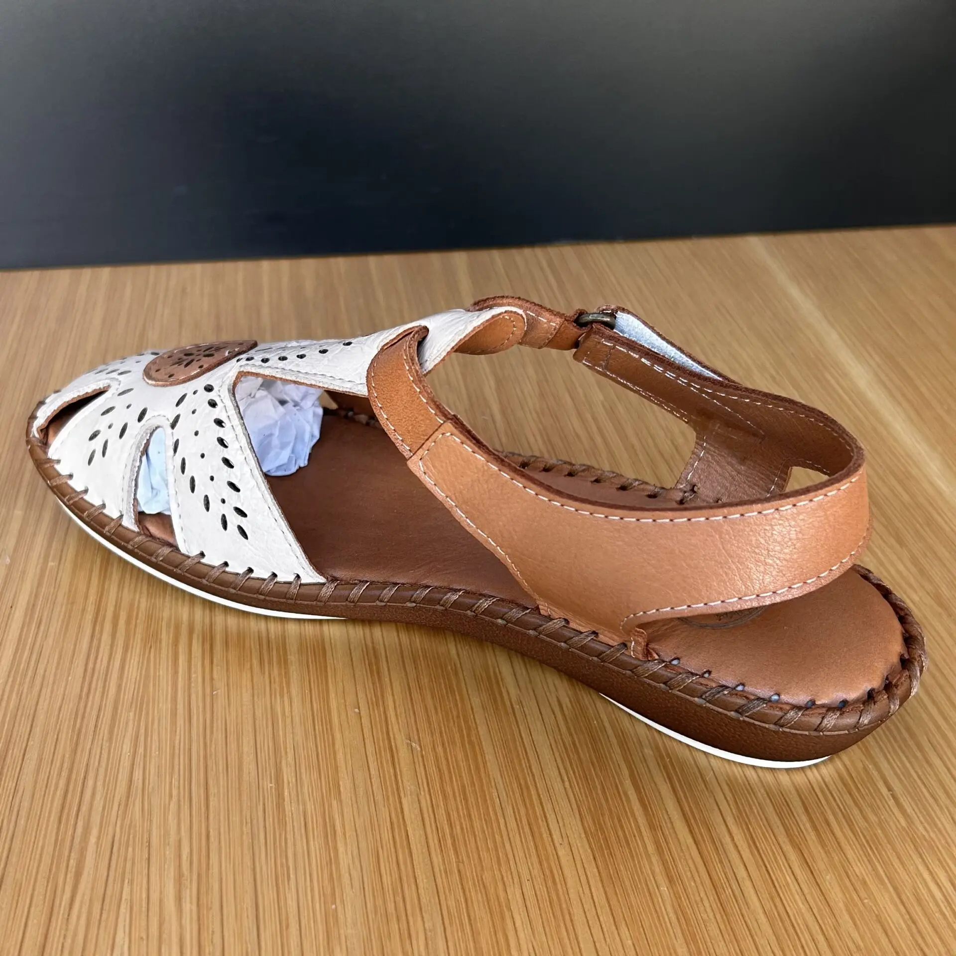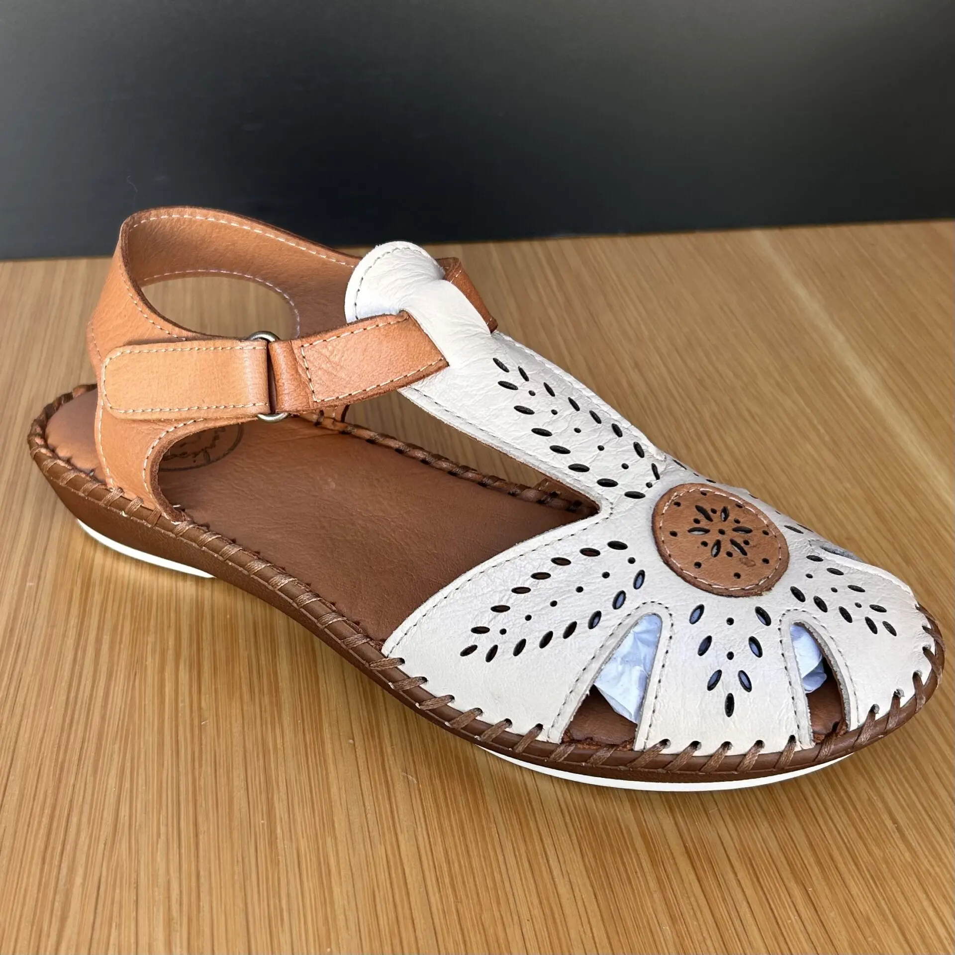 Su diseño cerrado en la parte delantera con acabado troquelado permite una buena transpiración, aportando además un toque artesanal y original. El contraste entre el tono beige y cuero le da un aire natural y elegante, fácil de combinar con cualquier look.