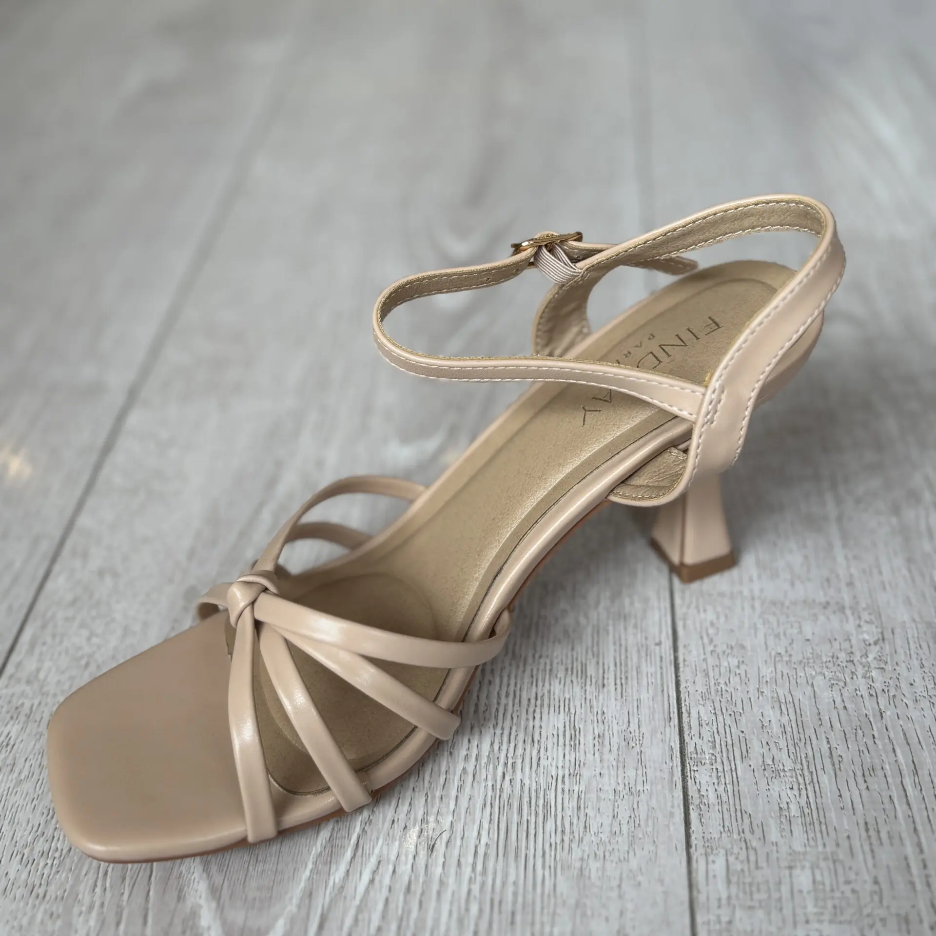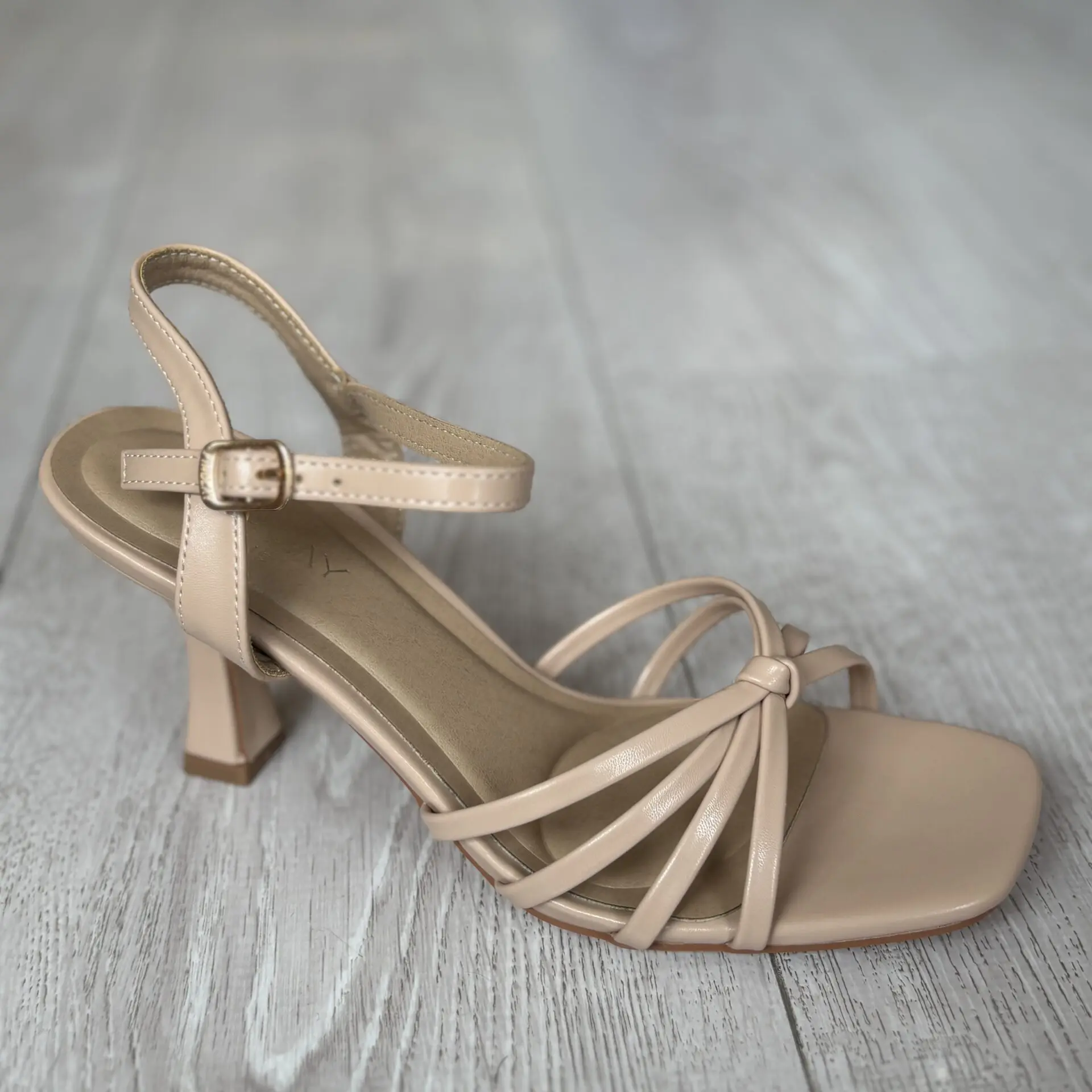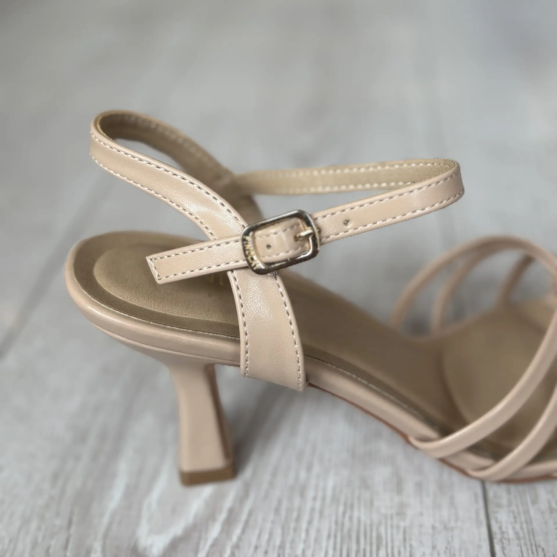 Sandalia nude de tacón medio con tiras finas, elegante y versátil. Perfecta para eventos y looks de verano.