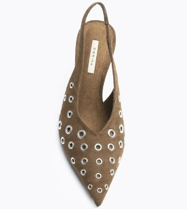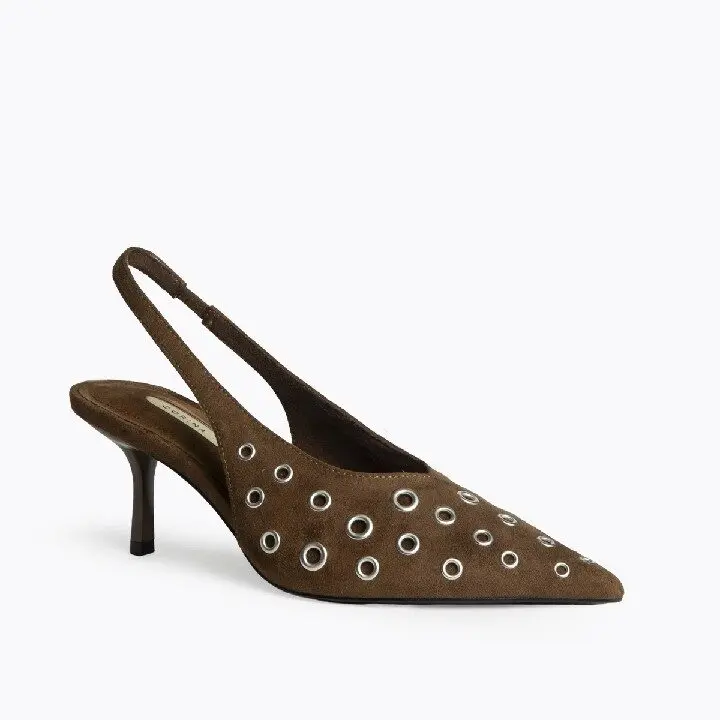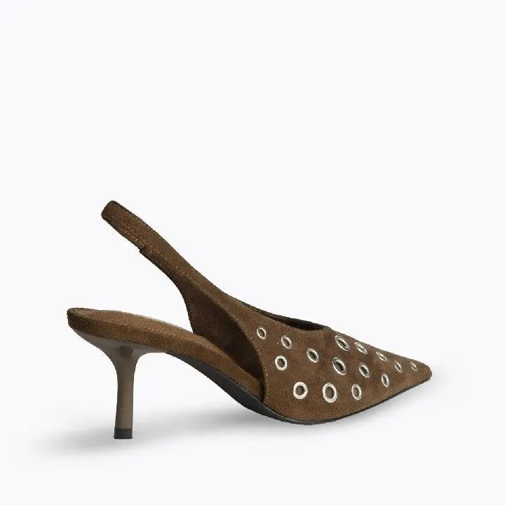 Zapato destalonado de tacón medio en serraje marrón con diseño en punta y detalles metálicos de aros en toda la superficie. Su estilo sofisticado con un toque rock chic lo convierte en una opción ideal para elevar tanto looks de día como de noche. El tacón fino aporta altura sin sacrificar comodidad, mientras que el diseño destalonado añade frescura y ligereza. Perfecto para combinar con vestidos, faldas o pantalones y destacar con un calzado diferente y con carácter.