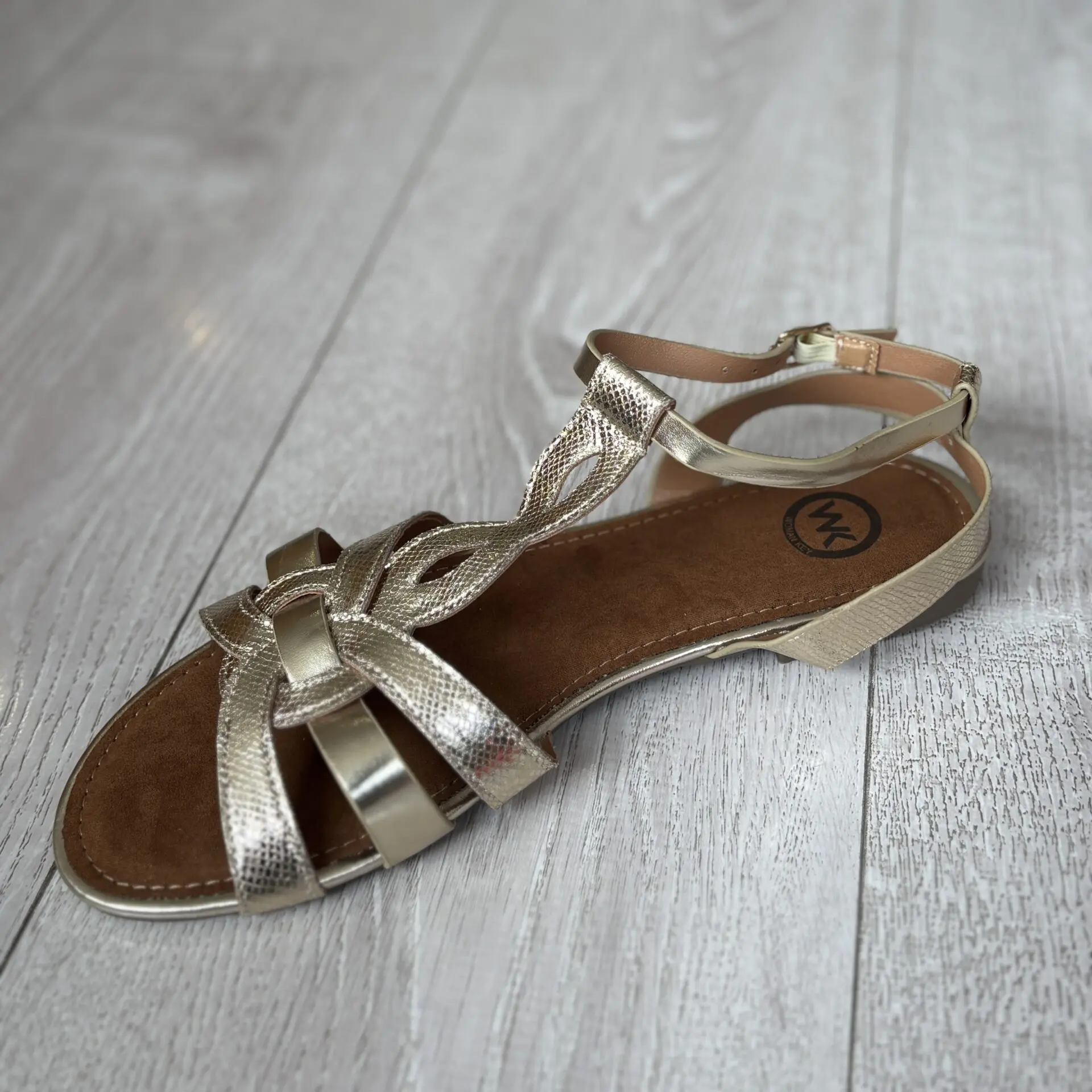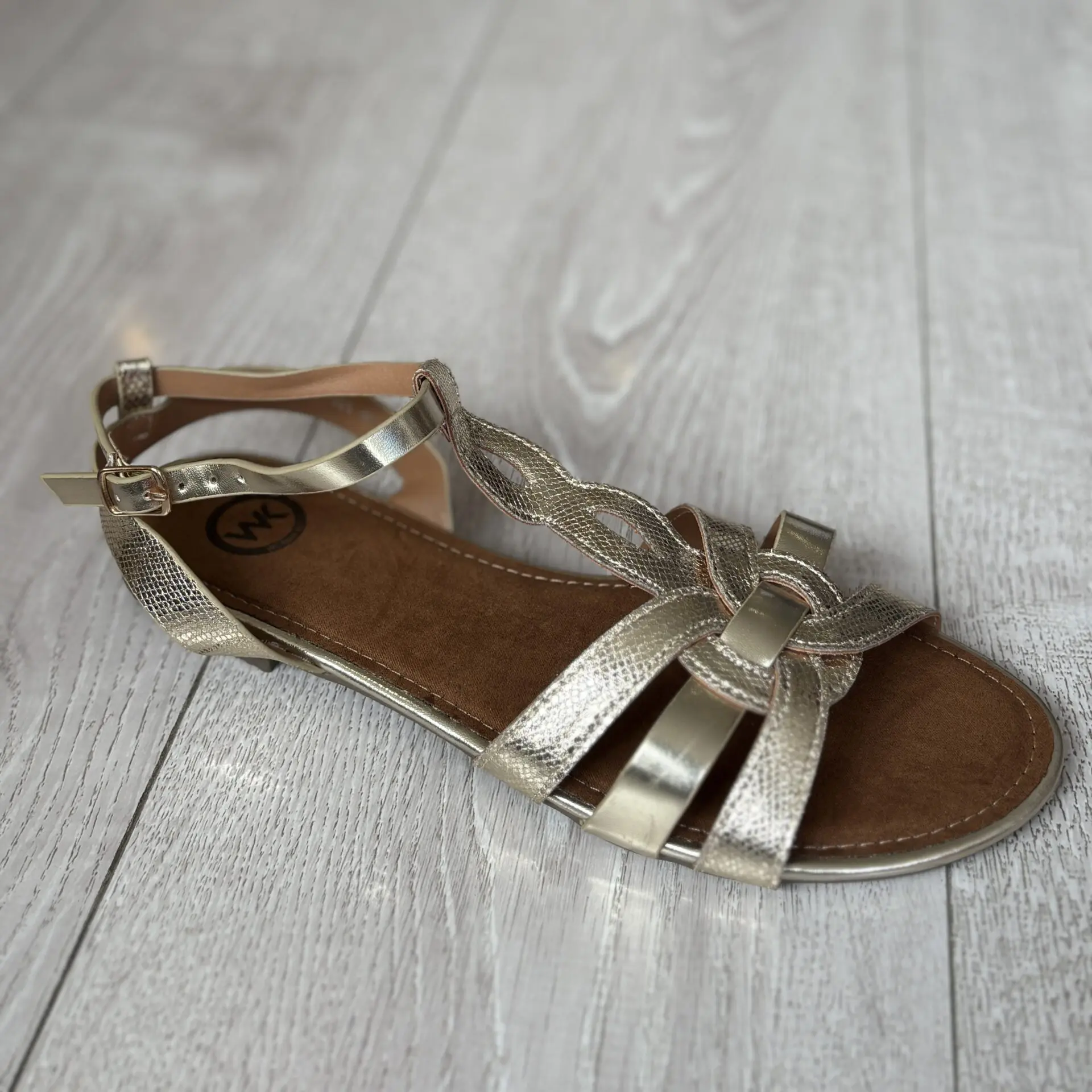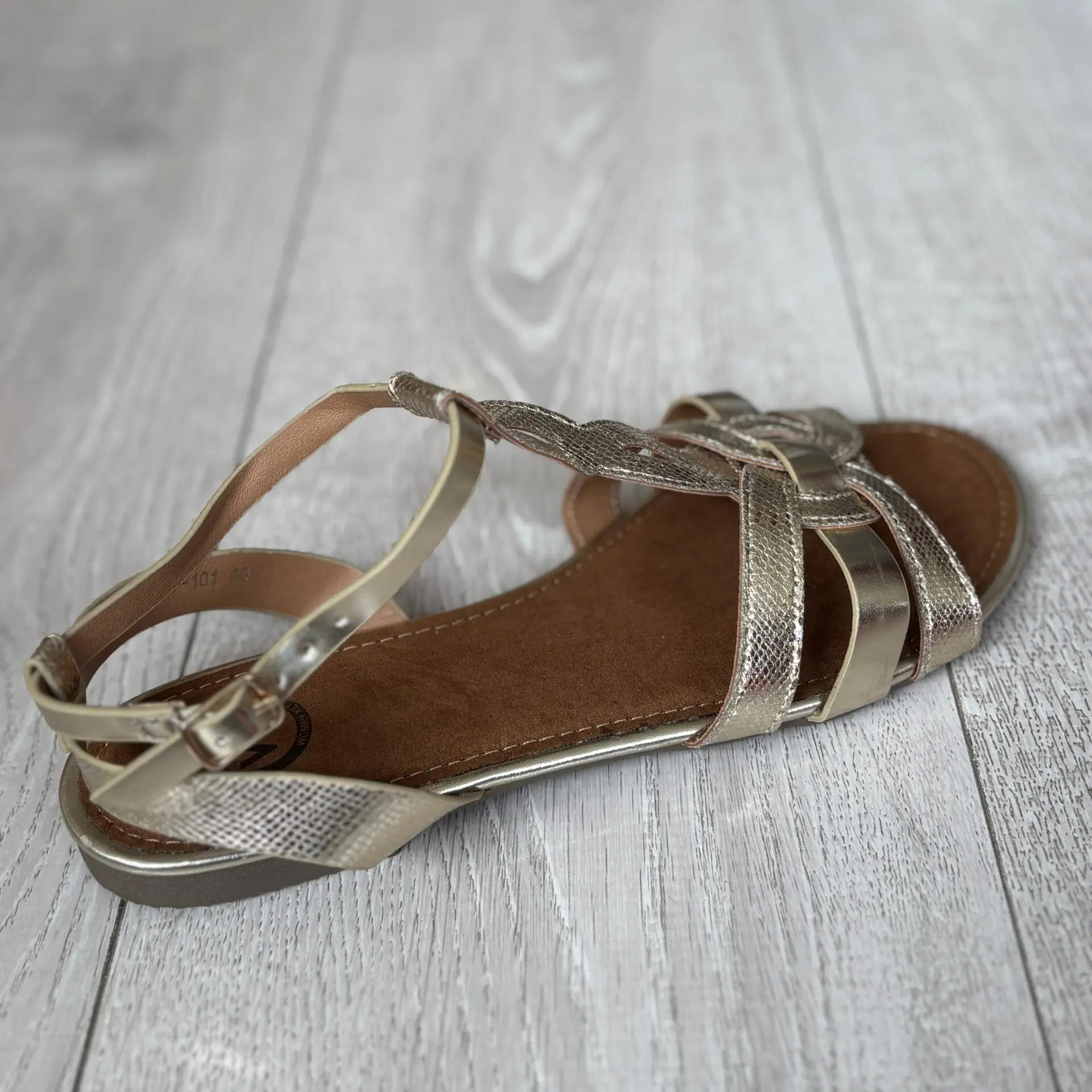 Sandalia dorada plana, elegante y cómoda, con cierre de hebilla. Perfecta para looks de verano y ocasiones especiales.