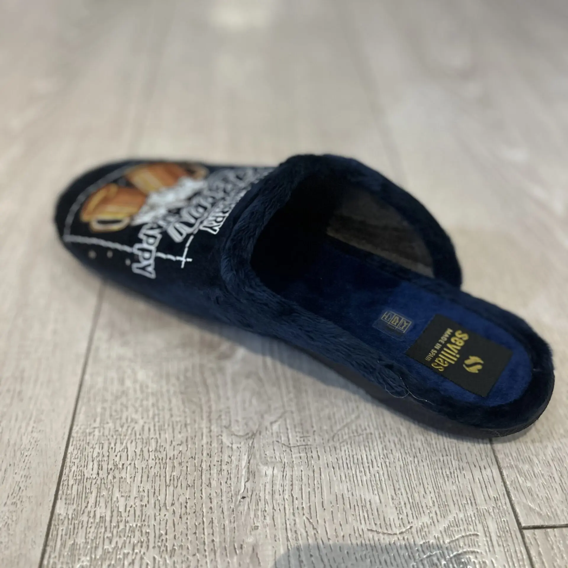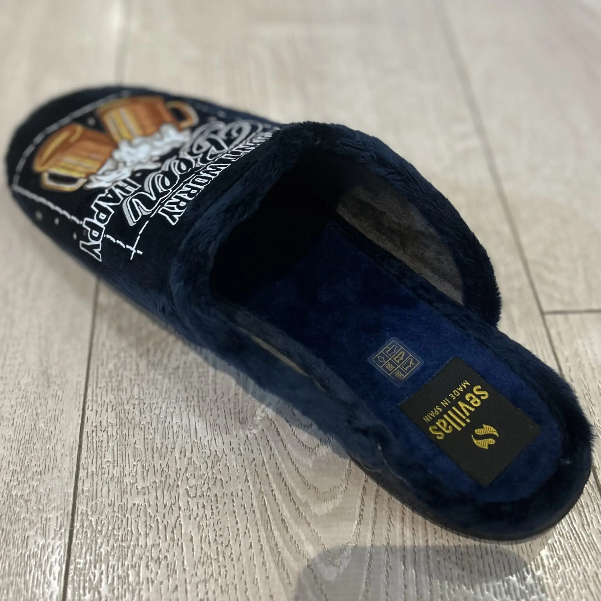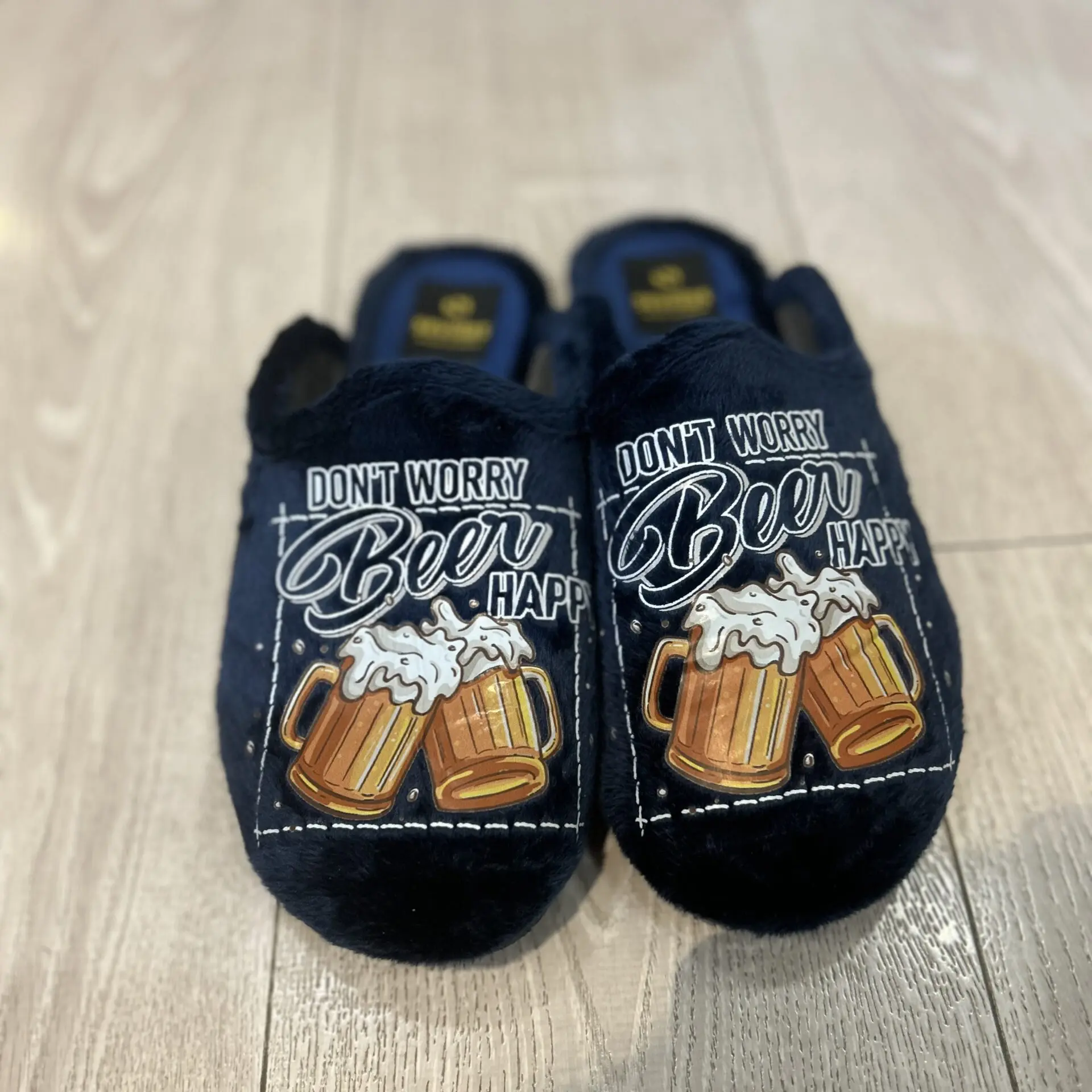 Zapatillas de casa para hombre con diseño divertido “Don’t Worry, Beer Happy”, ideales para quienes disfrutan de la comodidad con un toque de humor .