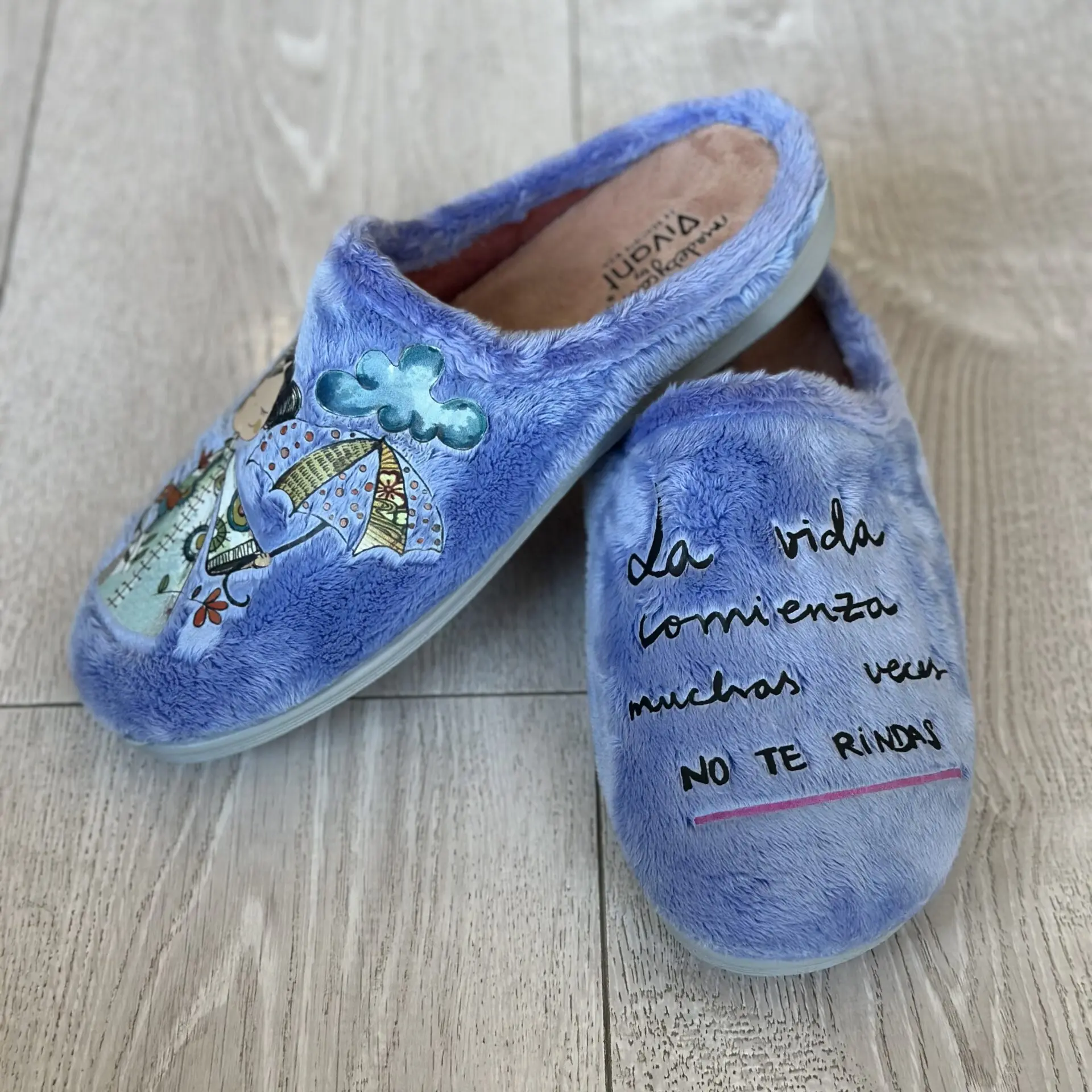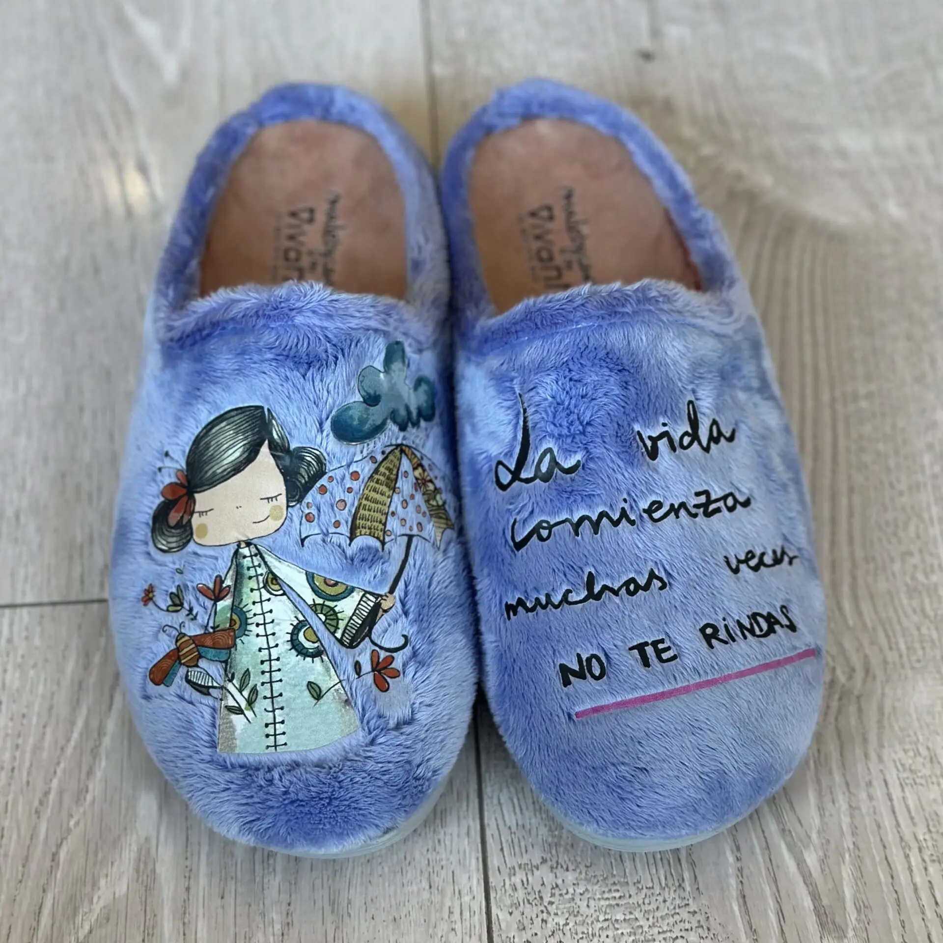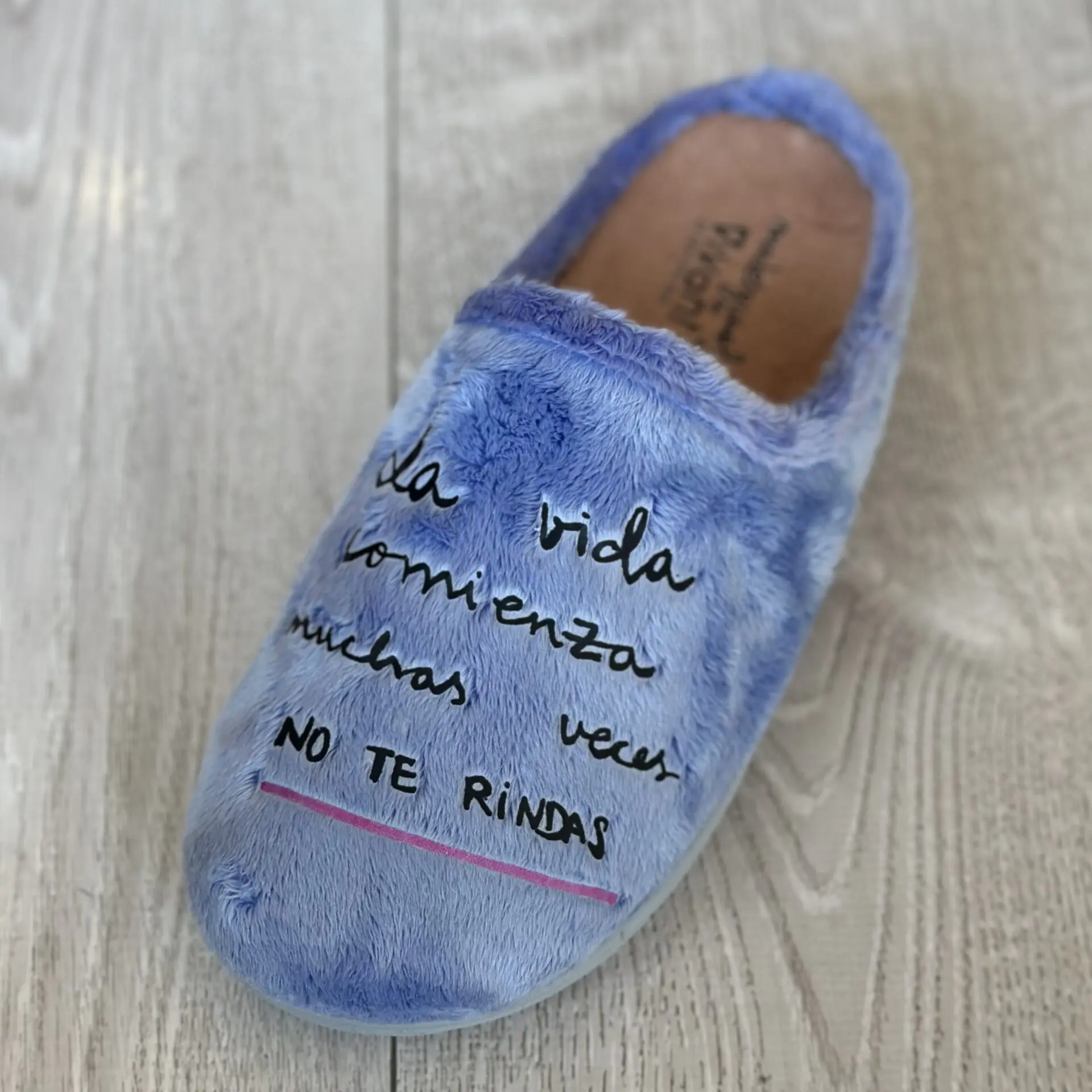 Zapatillas de casa con mensaje “La vida comienza muchas veces. No te rindas”, ideales para regalar o para recordarte cada día que siempre hay nuevos comienzos. 🌈✨