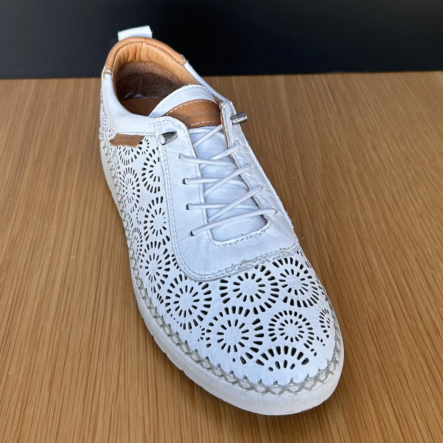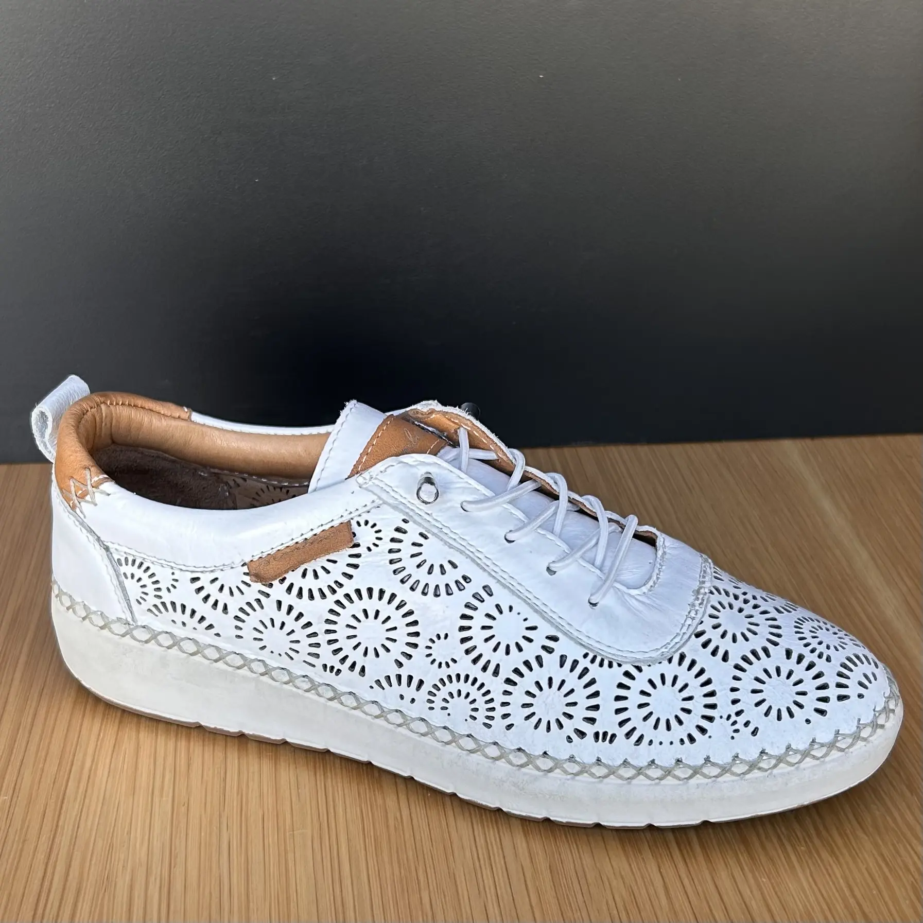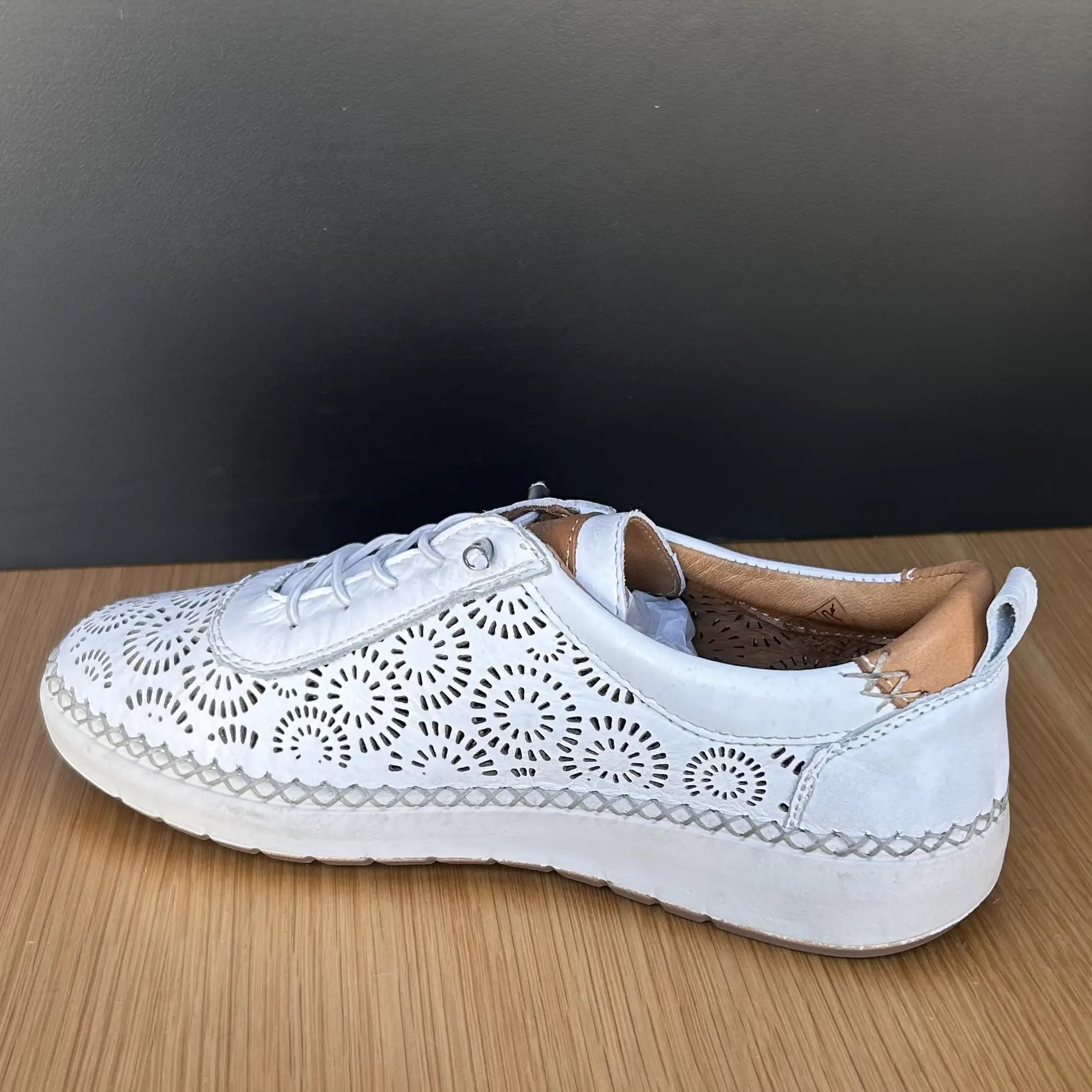 El zapato blanco troquelado es la combinación perfecta entre comodidad y estilo, ideal para los días de primavera y verano.