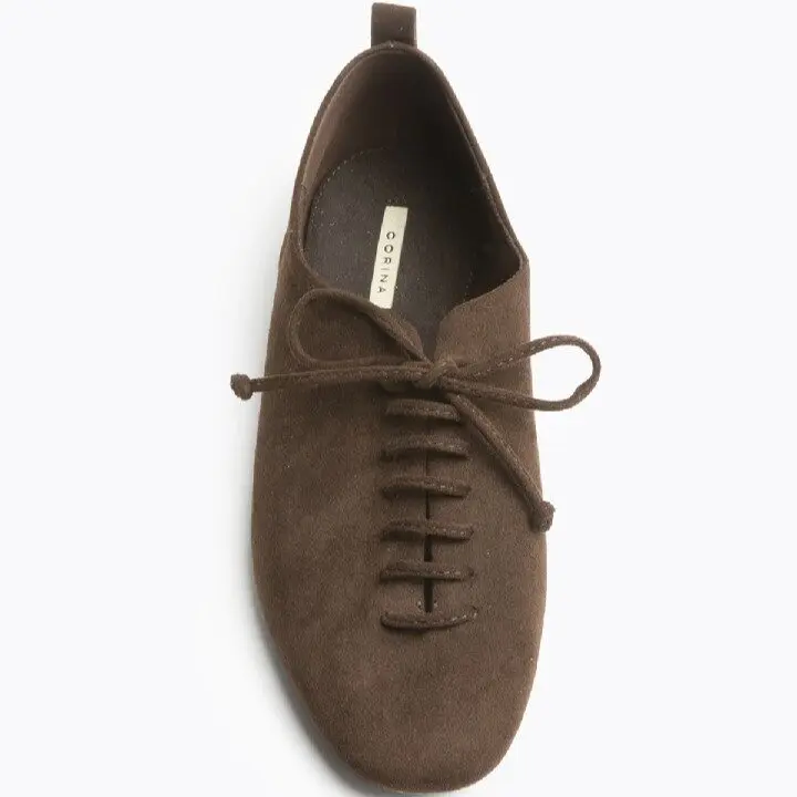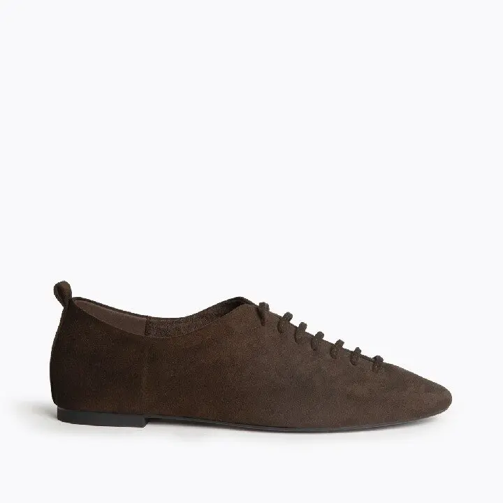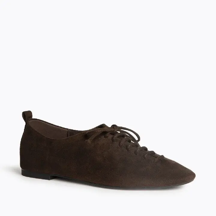 Zapato plano de serraje en color marrón, con diseño minimalista y elegante. Su puntera estilizada y el cierre de cordones aportan un aire sofisticado y atemporal, ideal para combinar tanto con looks de oficina como con conjuntos más casuales. La suela fina y flexible garantiza comodidad durante todo el día, convirtiéndolo en una opción versátil y práctica para cualquier ocasión.