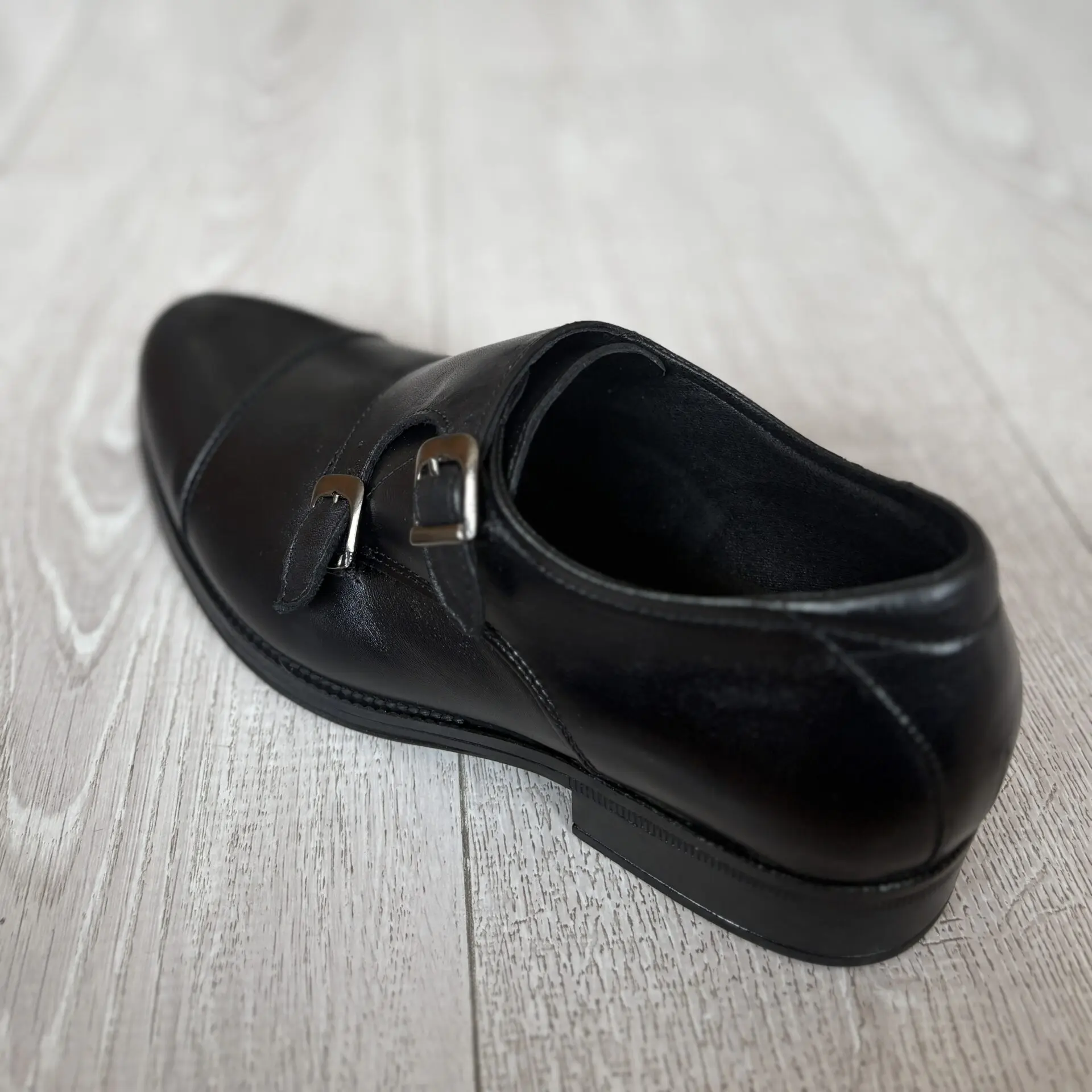 Fabricado en acabado liso y pulido, presenta una punta ligeramente estilizada con costura frontal, que refuerza su carácter formal. Las dos hebillas metálicas laterales no solo aportan personalidad al diseño, sino también un ajuste seguro y cómodo.