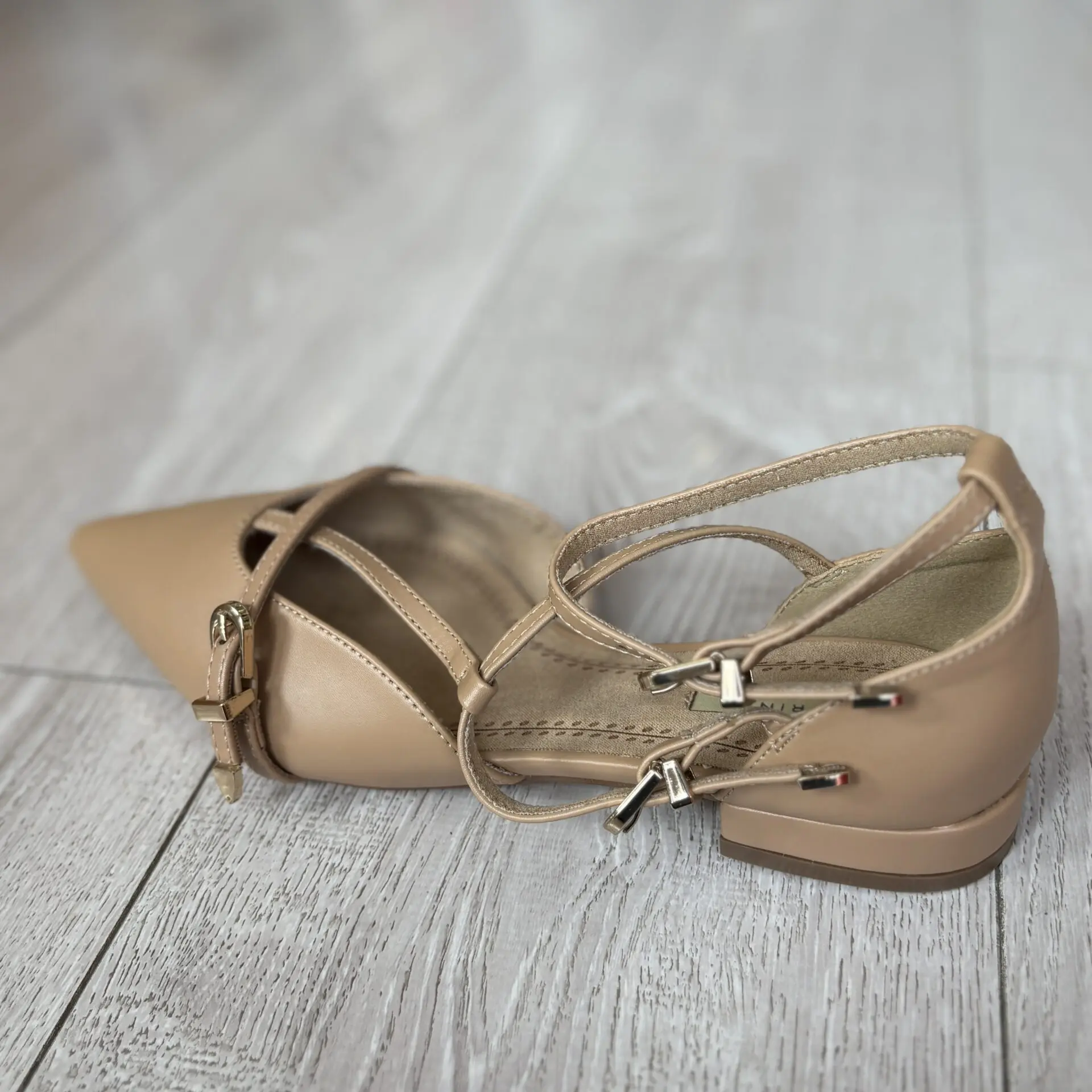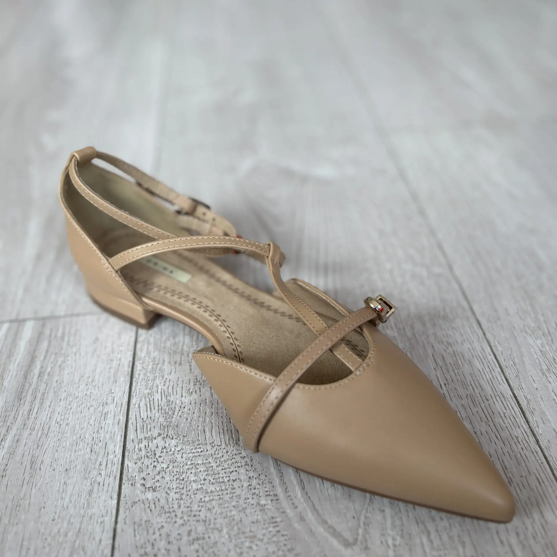 Zapato destalonado camel con tiras cruzadas y tacón bajo. Elegante, cómodo y perfecto para eventos u oficina.